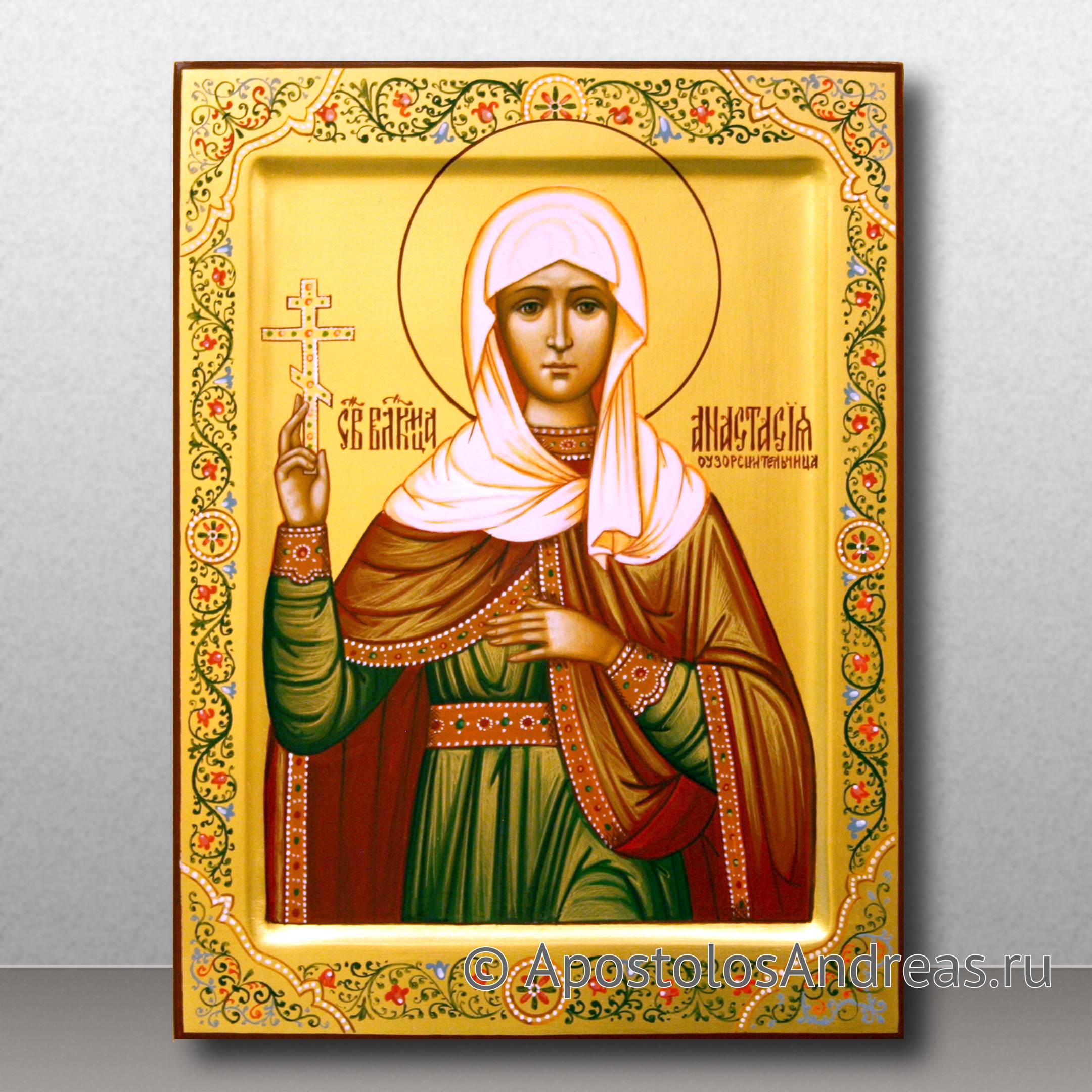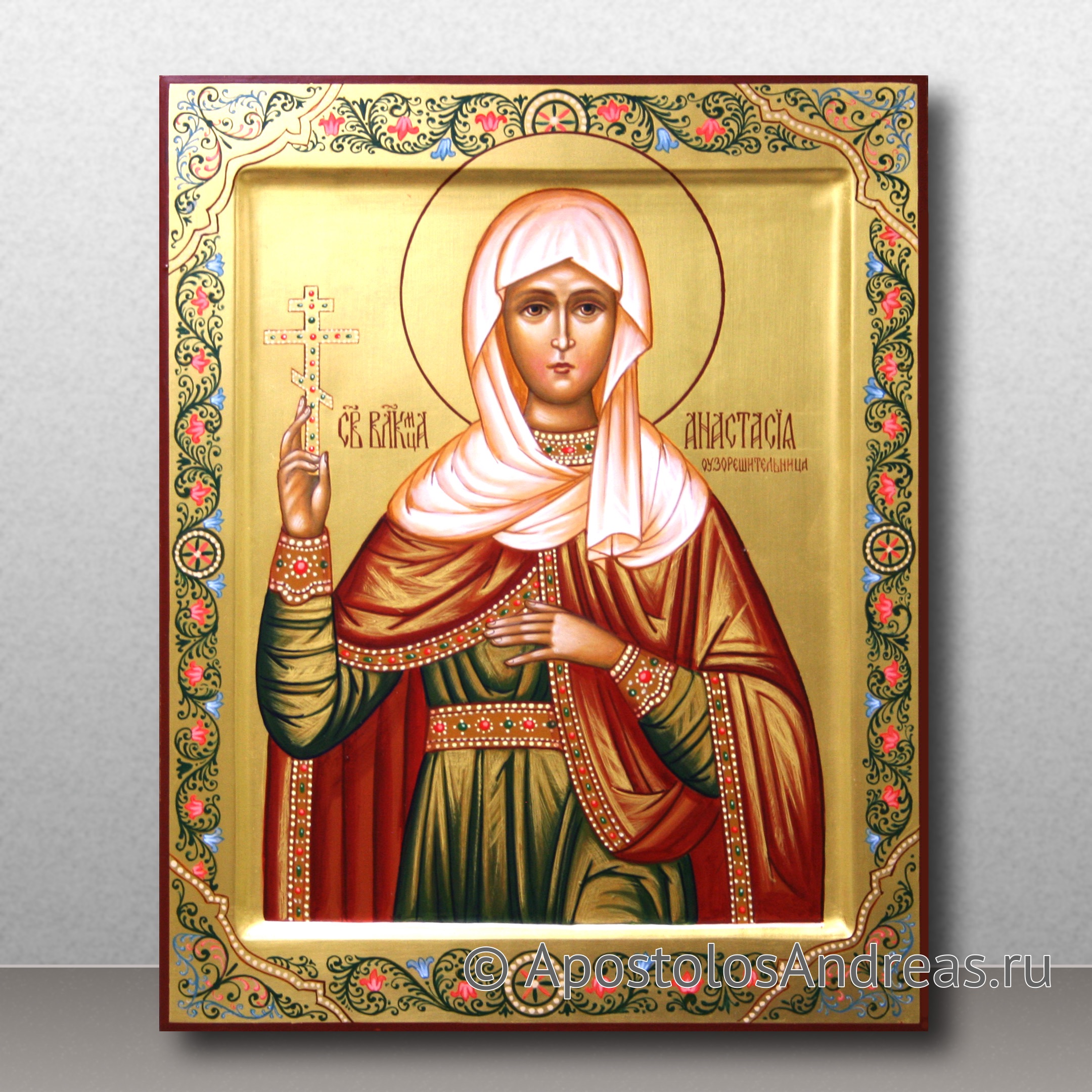 На этой иконе изображена молодая женщина, которая обеими руками держит сосуд. В этом сосуде находится масло — этим маслом она смазывала страдающим христианам раны. В итоге Анастасия Узорешительньца попала в руки прислужников императора Диоклитиана. Ей предложили взять драгоценности либо принять смерть. Она, не раздумывая, пожелала принять смерть за Христа вместо позорного проживания хоть и в достатке, но в безверии.