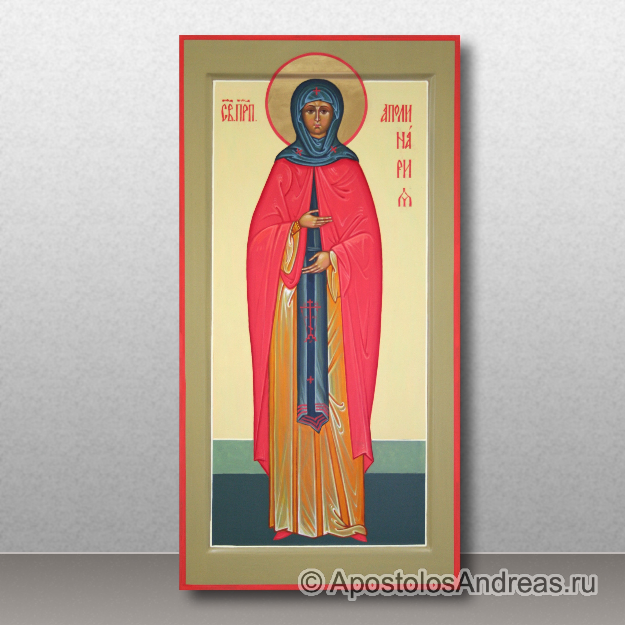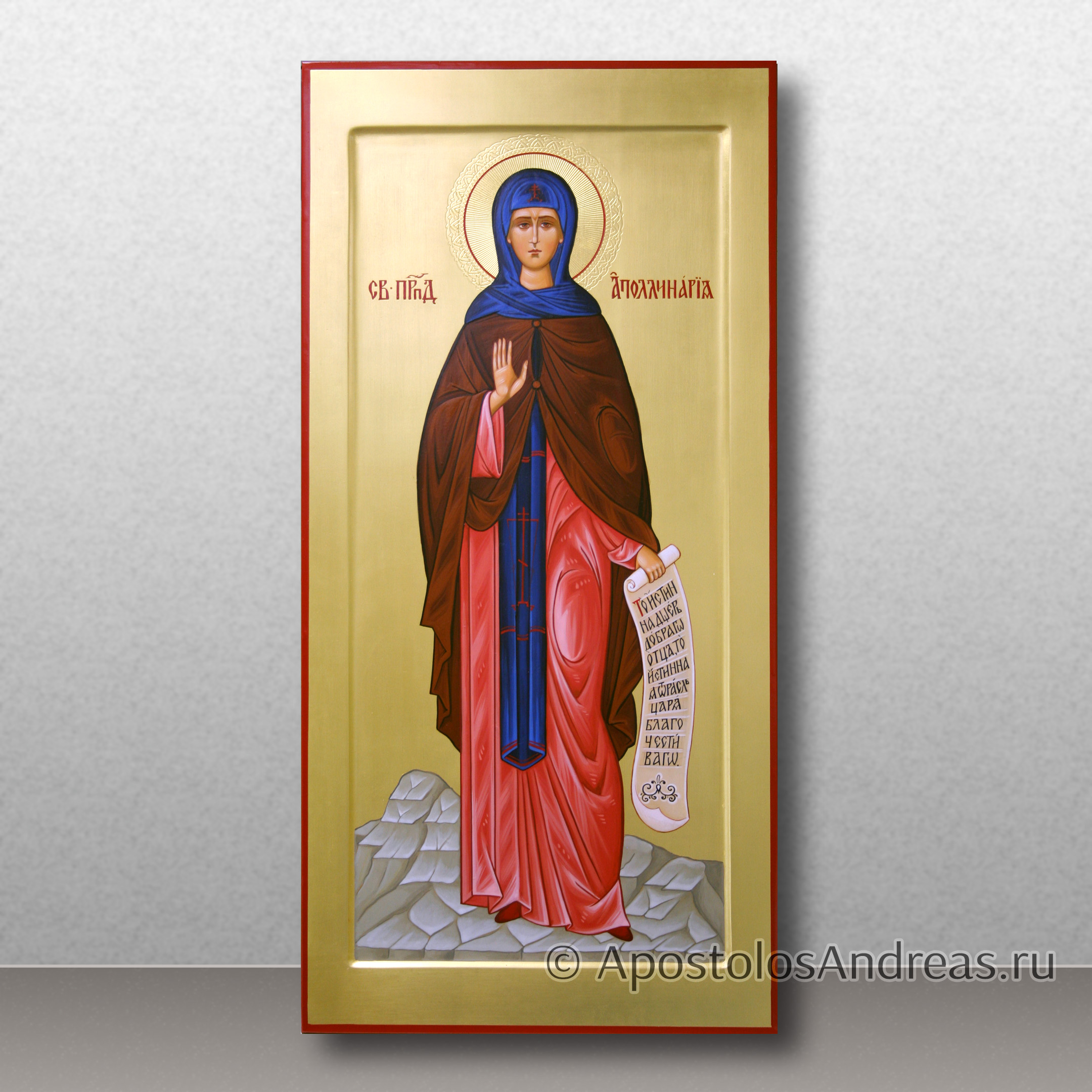 Святая Аполлинария, которую изображает данная икона, была дочерью первого министра Анфима и внучкой императора Маркиана. Благодаря своему благородному происхождению она получила превосходное образование. Родители страстно любили Аполлинарию и хотели найти ей доброго мужа, с которым бы она жила в любви, согласии и не знала бед. Сама же Аполлинария ничего не желала более, как скрыться от мирской суеты и посвятить свою жизнь служению Богу.