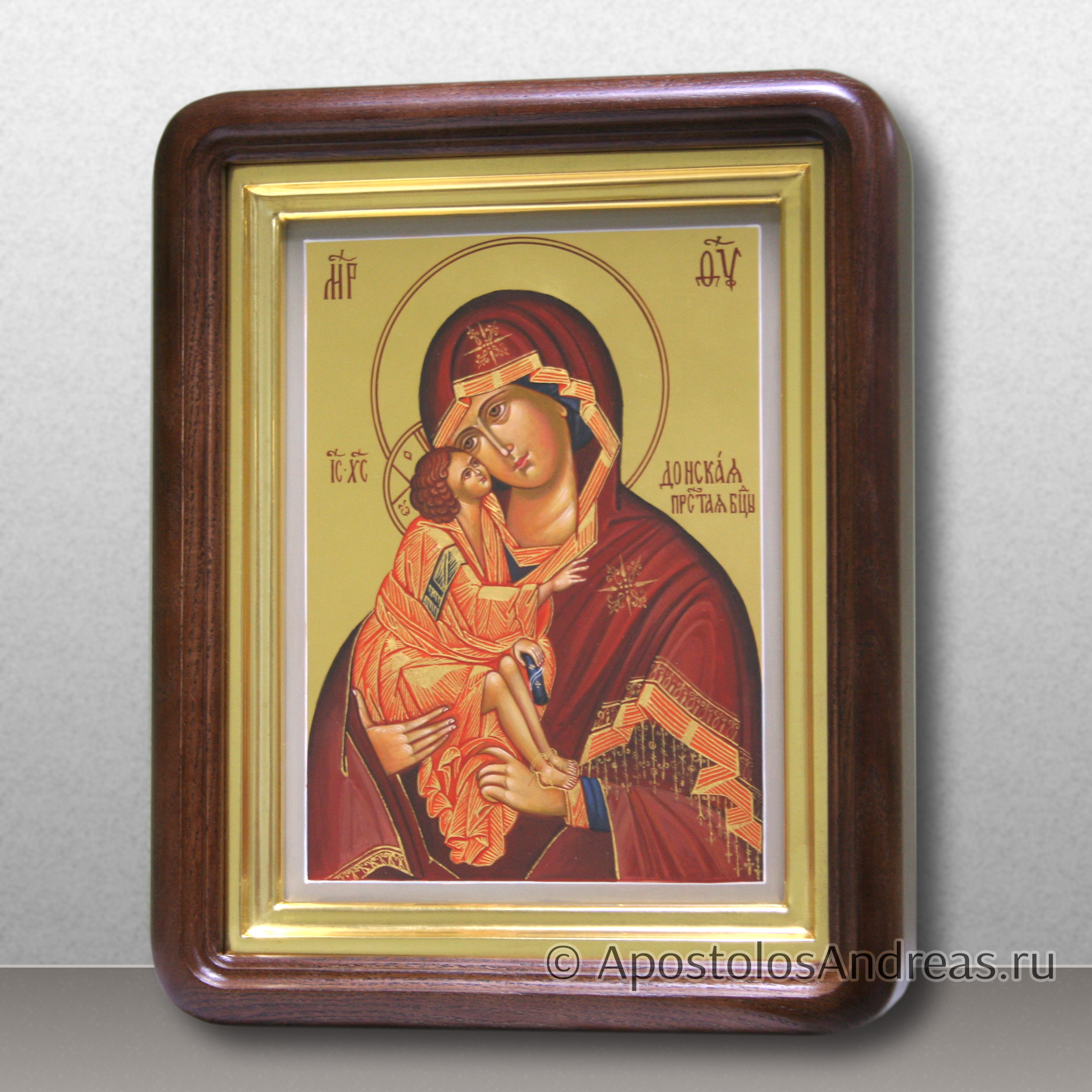 Образ Донской иконы Божией Матери был написан преподобным Феофаном Греком. По преданию, чудотворная икона была подарена великому князю Димитрию донскими казаками после Куликовской битвы. В честь этой победы икона обрела название — Донская. После чудесного заступничества Донского образа Богоматери при сражении в 1591 году с полчищами крымских татар, на месте, где произошло сражение был основан Донской монастырь. После принятия образа в дар донскими казаками Димитрий Донской передал эту икону в Москву. Первоначально икона была размещена в Кремле в Успенском соборе. В 1598 году патриарх Иов Донской иконой Божией Матери благословил на царство Бориса Годунова. Ныне икона находится в Государственной Третьяковской галерее. Ежегодно для праздничной службы ее доставляют в Донской монастырь, где священное сословие Москвы чествует великую святыню.
