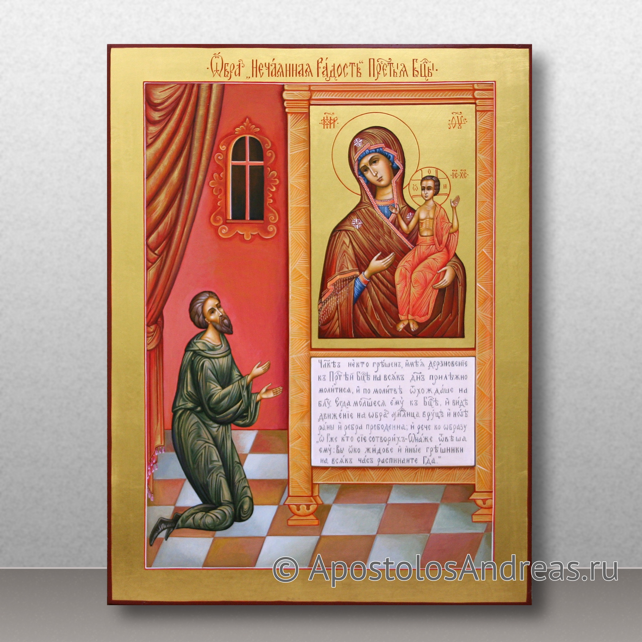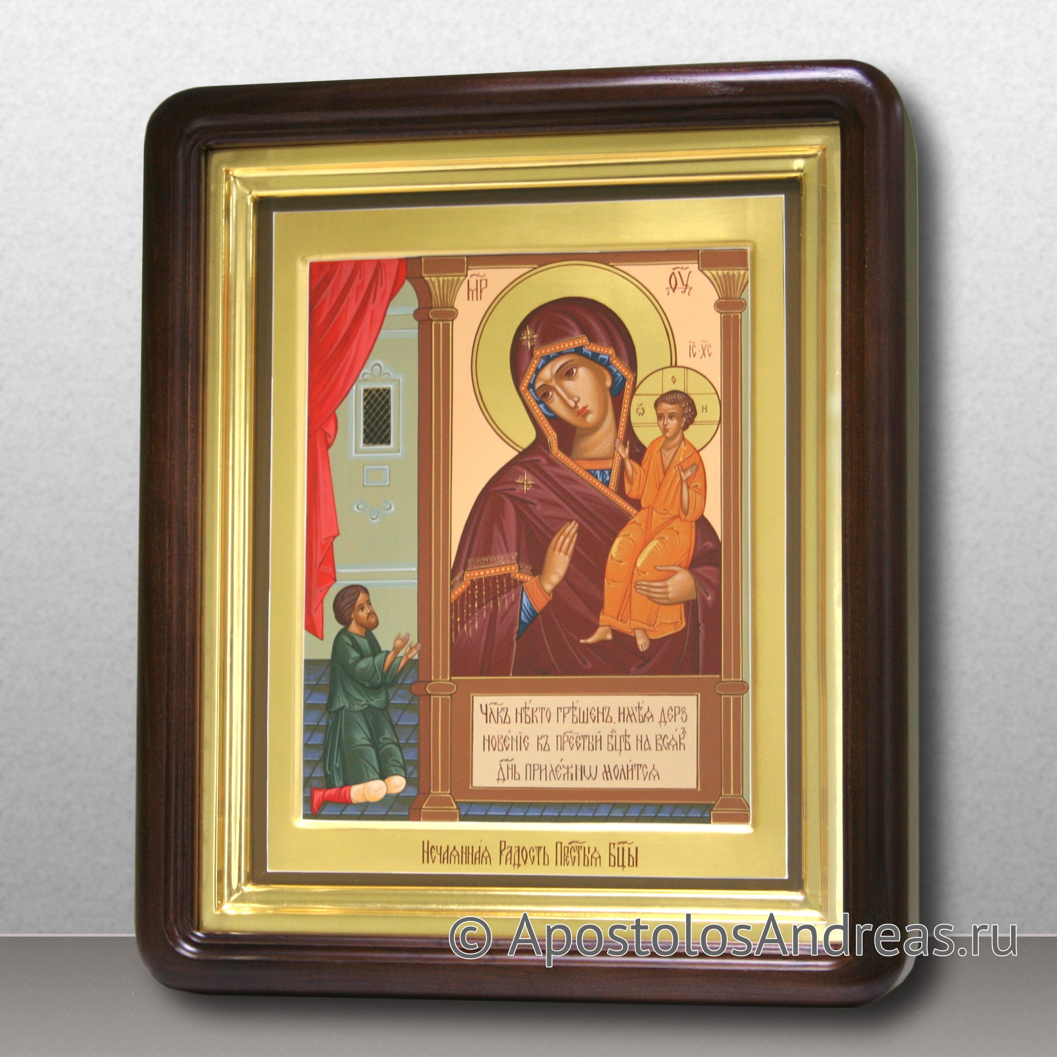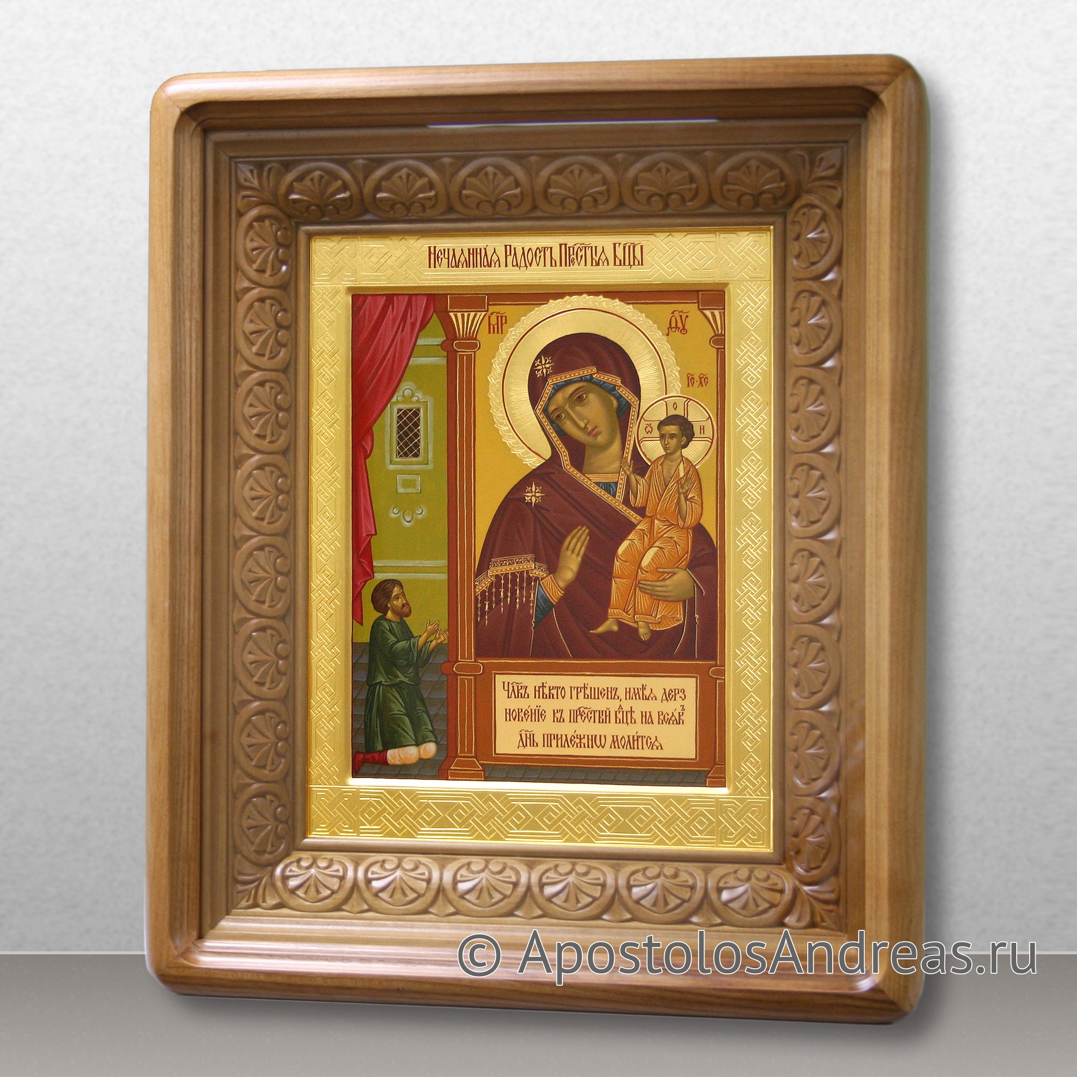 На иконе "Нечаянная Радость" Божьей Матери изображен молодой человек, который молится на коленях перед иконой Пресвятой Богородицы. Этот образ иконы вдохновлен преданием о чудесном исцелении юноши, страдавшего от плотских страстей, благодаря святой иконе Богородицы. Это предание описано в труде святителя Димитрия Ростовского "Руно Орошенное".