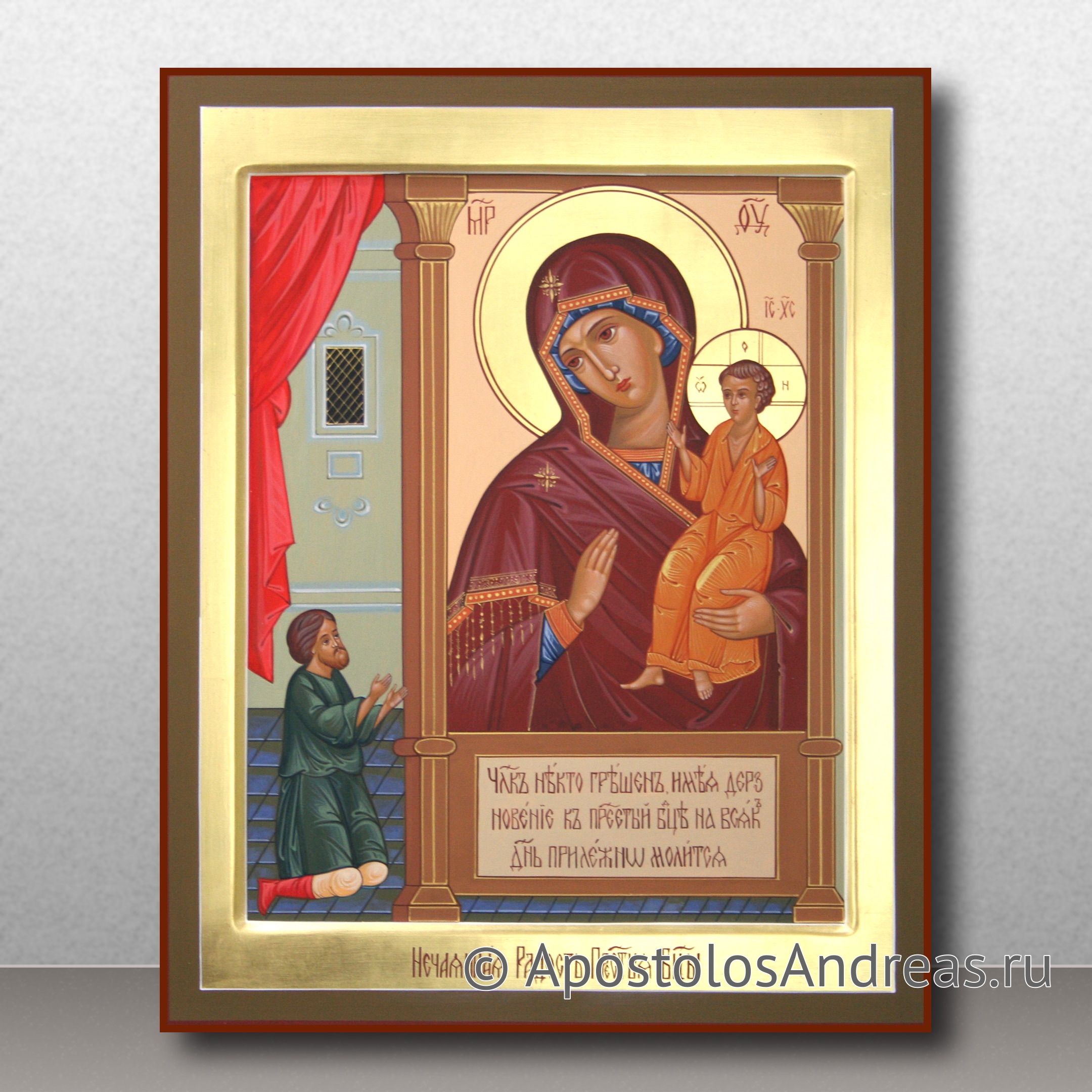 Рассказ гласит о юноше, который жил в грехе и часто молился перед иконой Пречистой, произнося архангельское приветствие: "Радуйся, Благодатная, Господь с Тобою". Однажды, готовясь к новому греховному поступку, он внезапно увидел, что на изображении Богородицы на иконе произошло чудо: у Божественного Младенца на руках и ногах появились язвы, из которых текла кровь, а также из ребра Его. Удивленный и испуганный молодой человек спросил Богородицу: "О, Госпожа, кто сделал это?" И Богородица ответила: "Ты и другие грешники своими грехами вновь распинаете Моего Сына". В этот момент юноша осознал глубину своего греха и стал молиться с искренними слезами о прощении перед Богородицей и Спасителем.