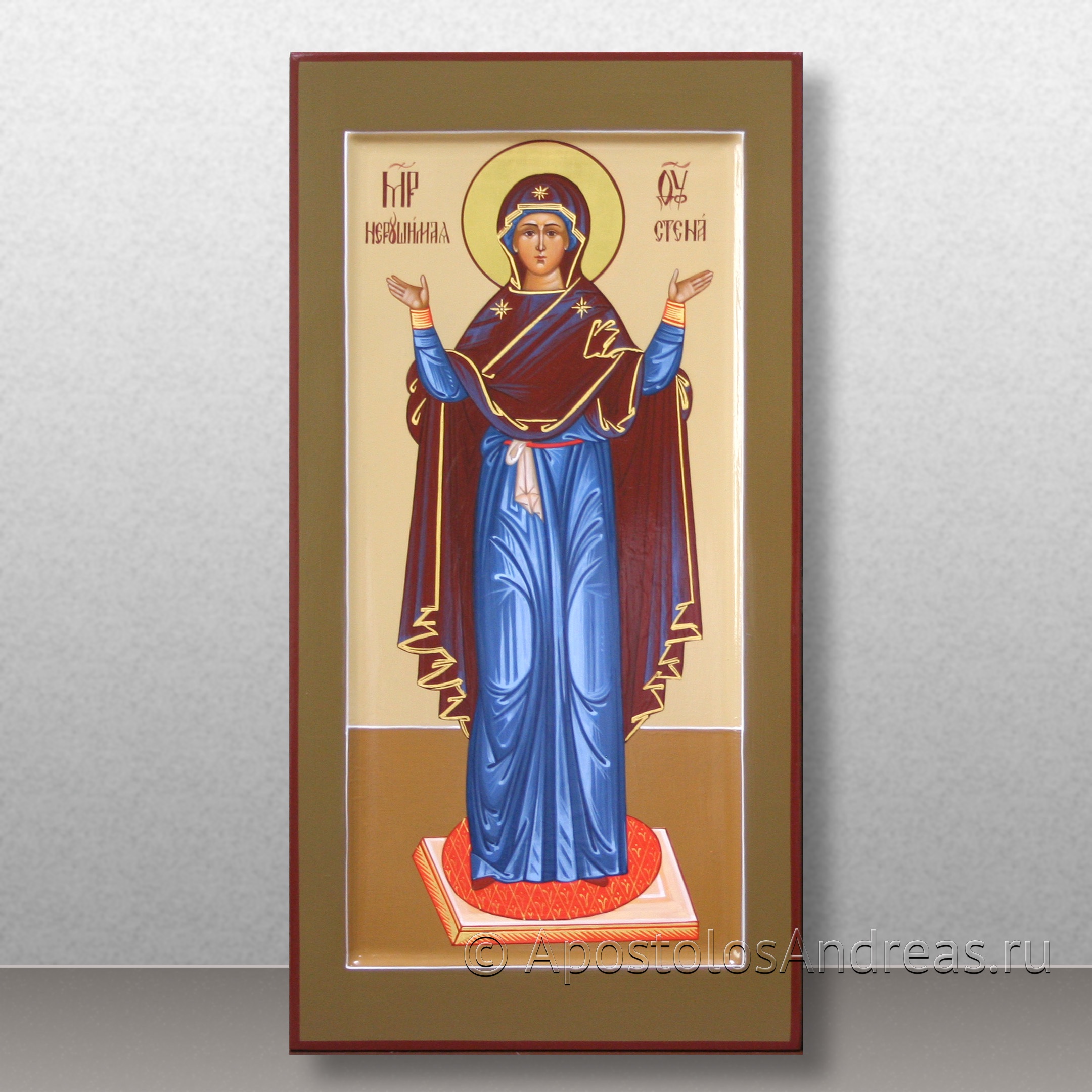 Эта икона получила свое имя "Нерушимая Стена" благодаря своей истории сохранения. В течение девяти веков она оставалась неповрежденной, несмотря на разрушения, которые неоднократно постигали как собор, так и город. Описывая эту икону, можно сказать, что Богородица изображена величественно, стоя на золотом камне, как незыблемом фундаменте, принимающем всех, кто обращается к Ней для защиты. Ее хитон небесного цвета, а на ее поясе виден червленый пояс и лентион, которым она отирает слезы. Ее руки, поднятые к небу, украшают лазуревые поручи. Золотое покрывало опускается с Ее головы и перевешено через левое плечо, символизируя Ее покров и образ облака, о котором поют церковные гимны. На Ее челе светит яркая звезда, а на ее плечах видны две звезды, напоминая, что она сама, как Матерь Незаходимого Света, принесла нам зарю Незаходимого Солнца.
