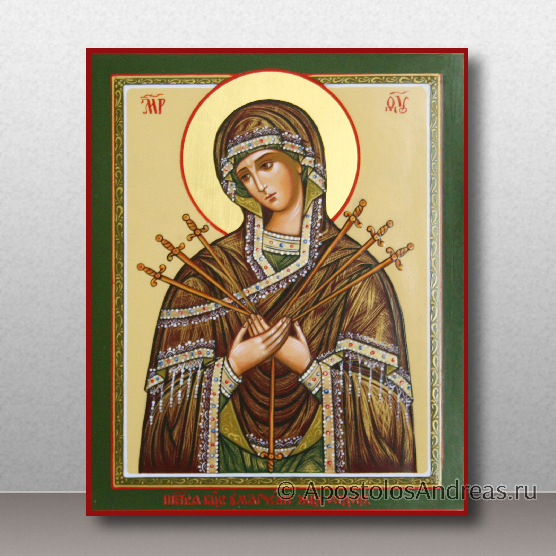 - Главная отличительная черта – семь мечей (иногда изображаются стрелы), пронзающих грудь Пресвятой Богородицы