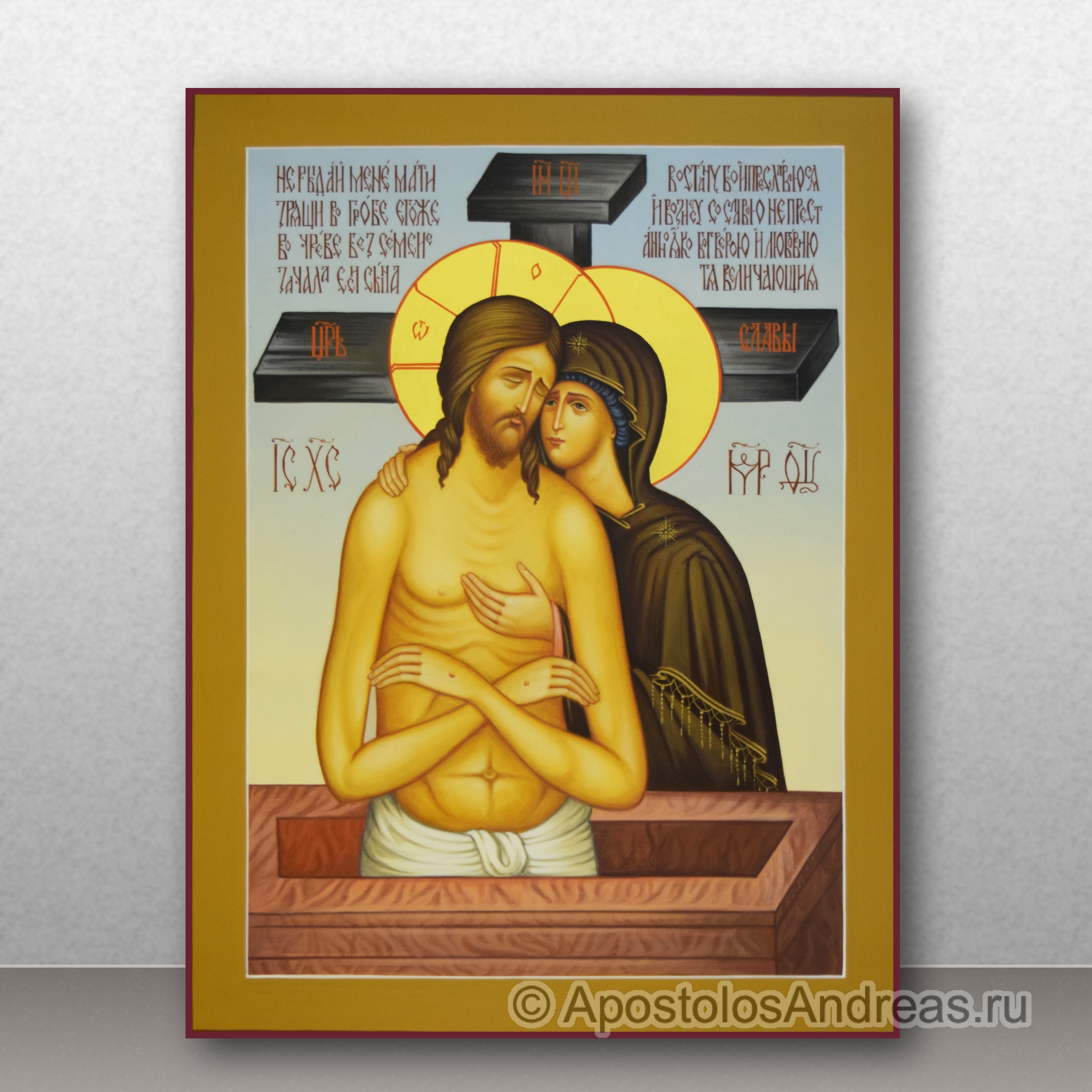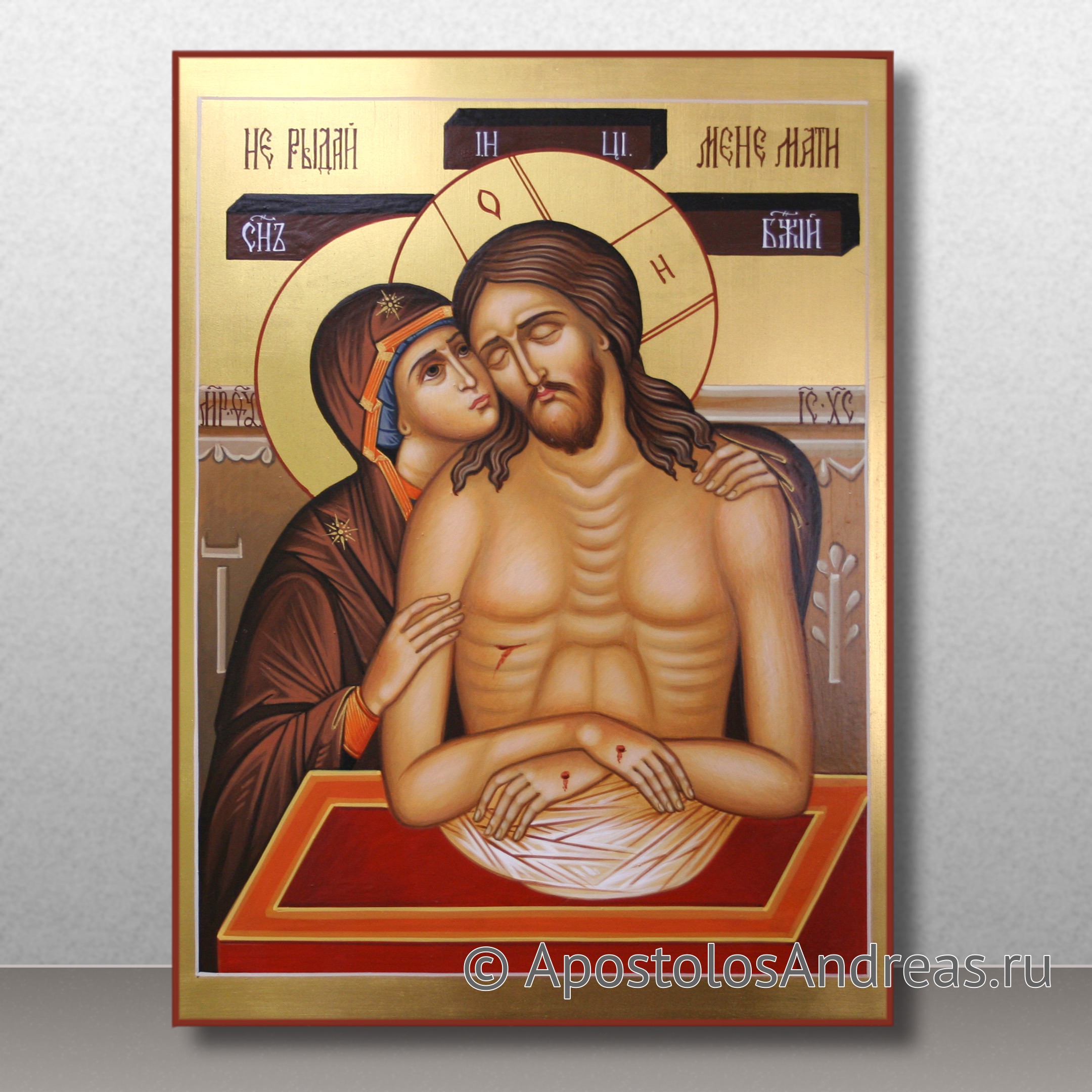 Образ часто называют «Пиета», что в переводе с греческого языка означает «оплакивание». На священном полотне изображена Божия Матерь, прижимающая к себе тело Иисуса. По типу образ похож на серию икон «Умиление», почитаемую во всем христианском мире. Купить икону Богородицы «Не рыдай мне Мати» для домашнего иконостаса вы можете в нашей мастерской.