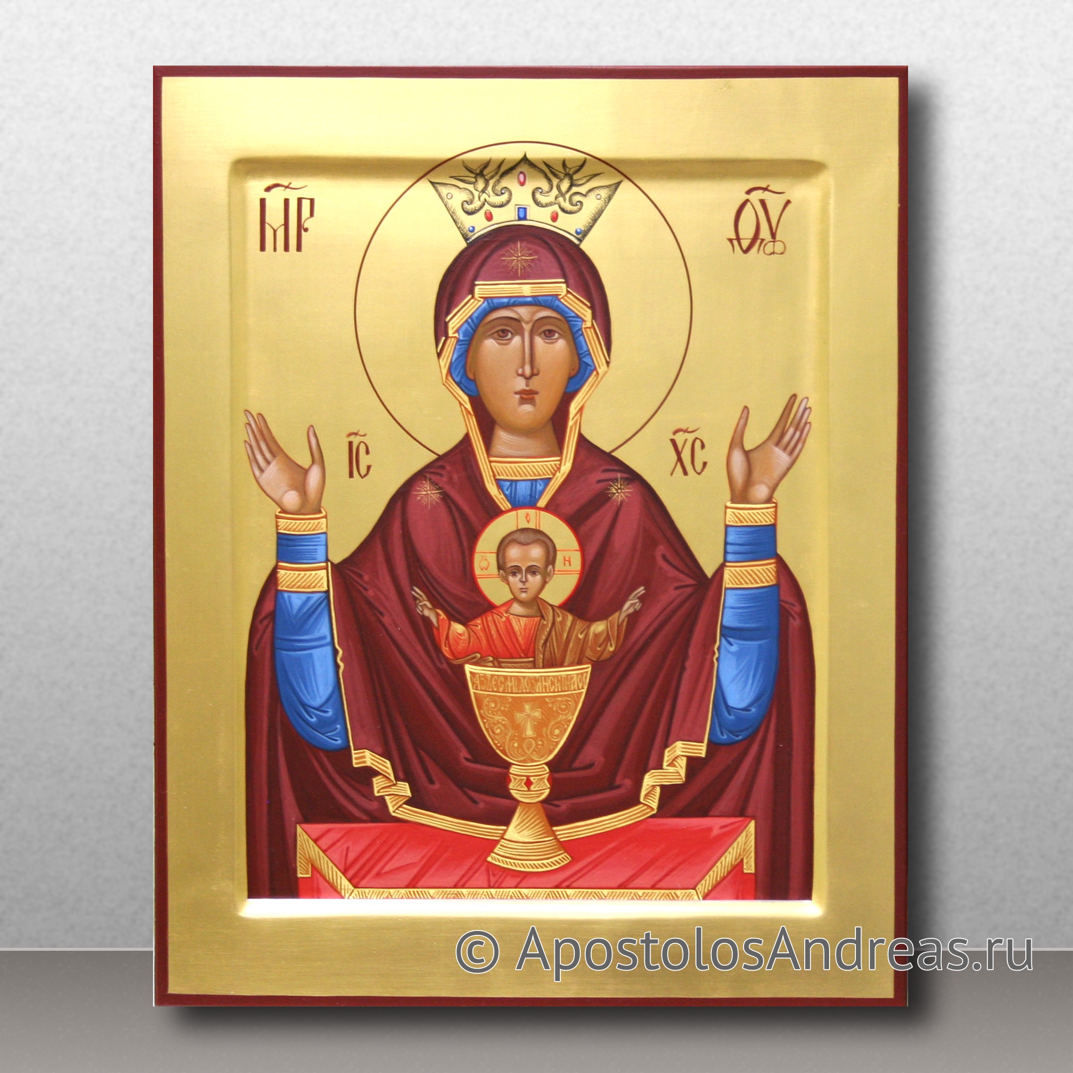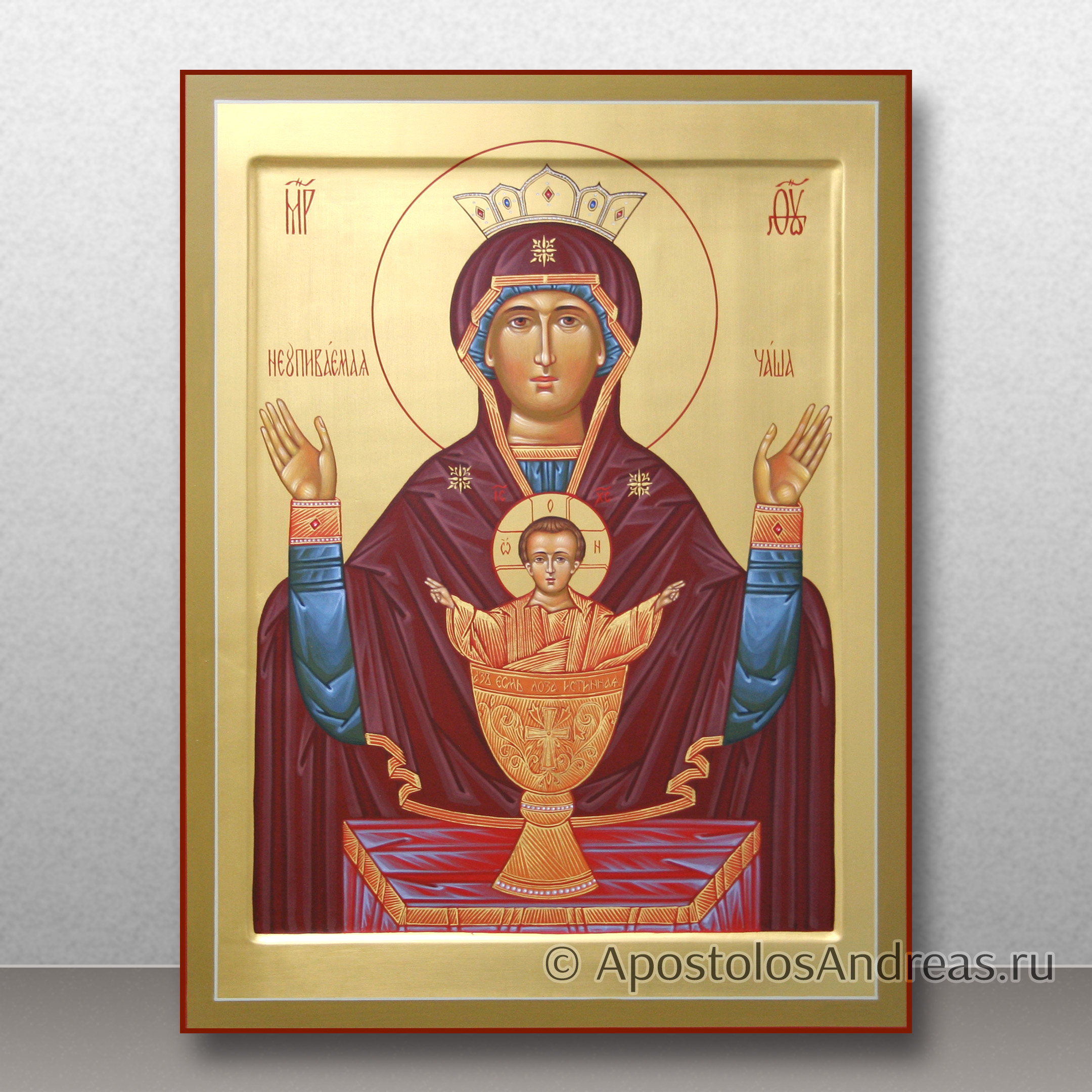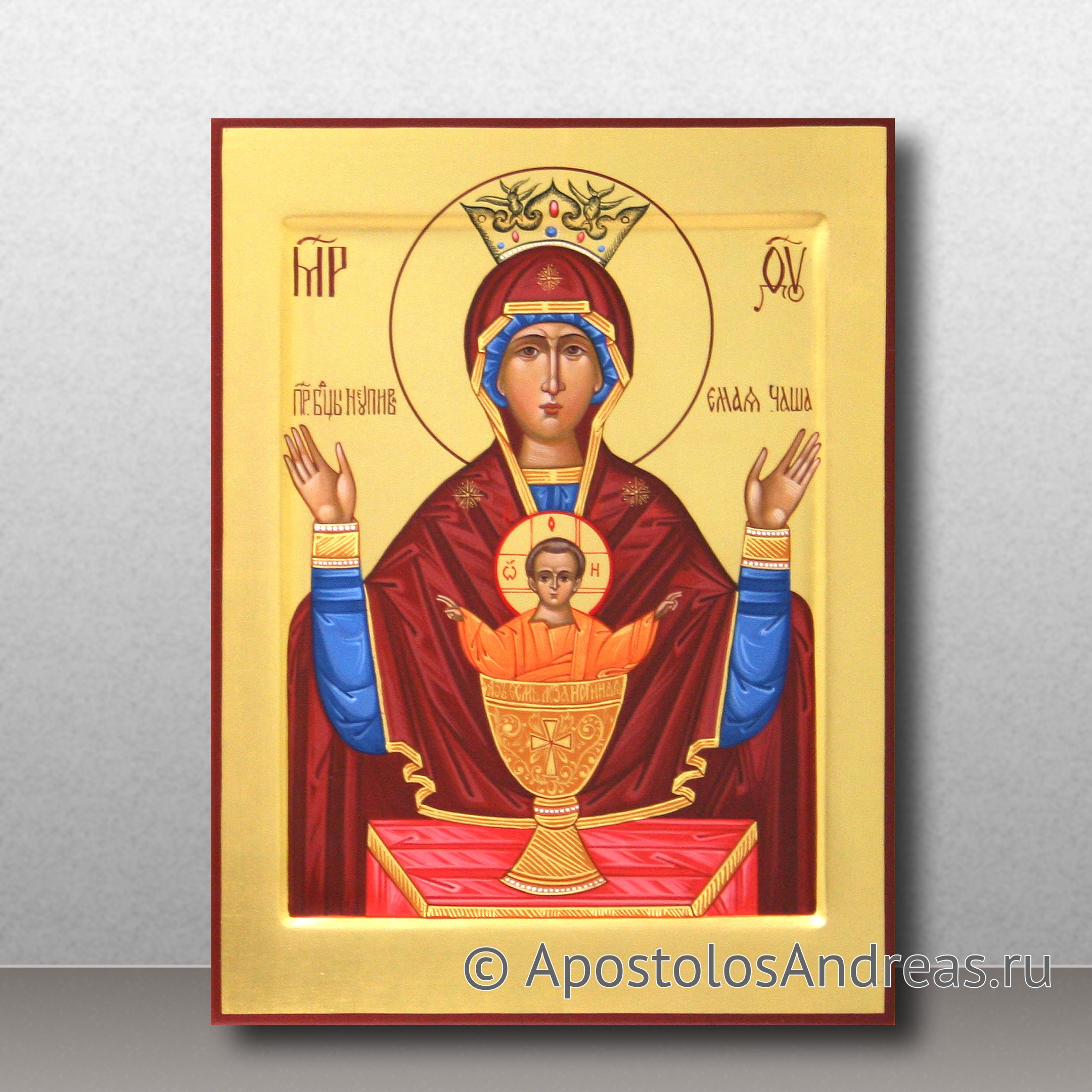 Всего несколько веков назад была обнаружена икона Божией Матери «Неупиваемая чаша». Доподлинно о ее происхождении ничего неизвестно, хотя многие мастера-иконописцы и историки пытаются разгадать тайну появления чудотворного образа. На полотне изображены Богородица и младенец Иисус, стоящий в золотой чаше. Чаша представляет собой символ причащения, отпущения грехов и утешения. Купить рукописную икону Неупиваемая Чаша вы можете в нашей мастерской.