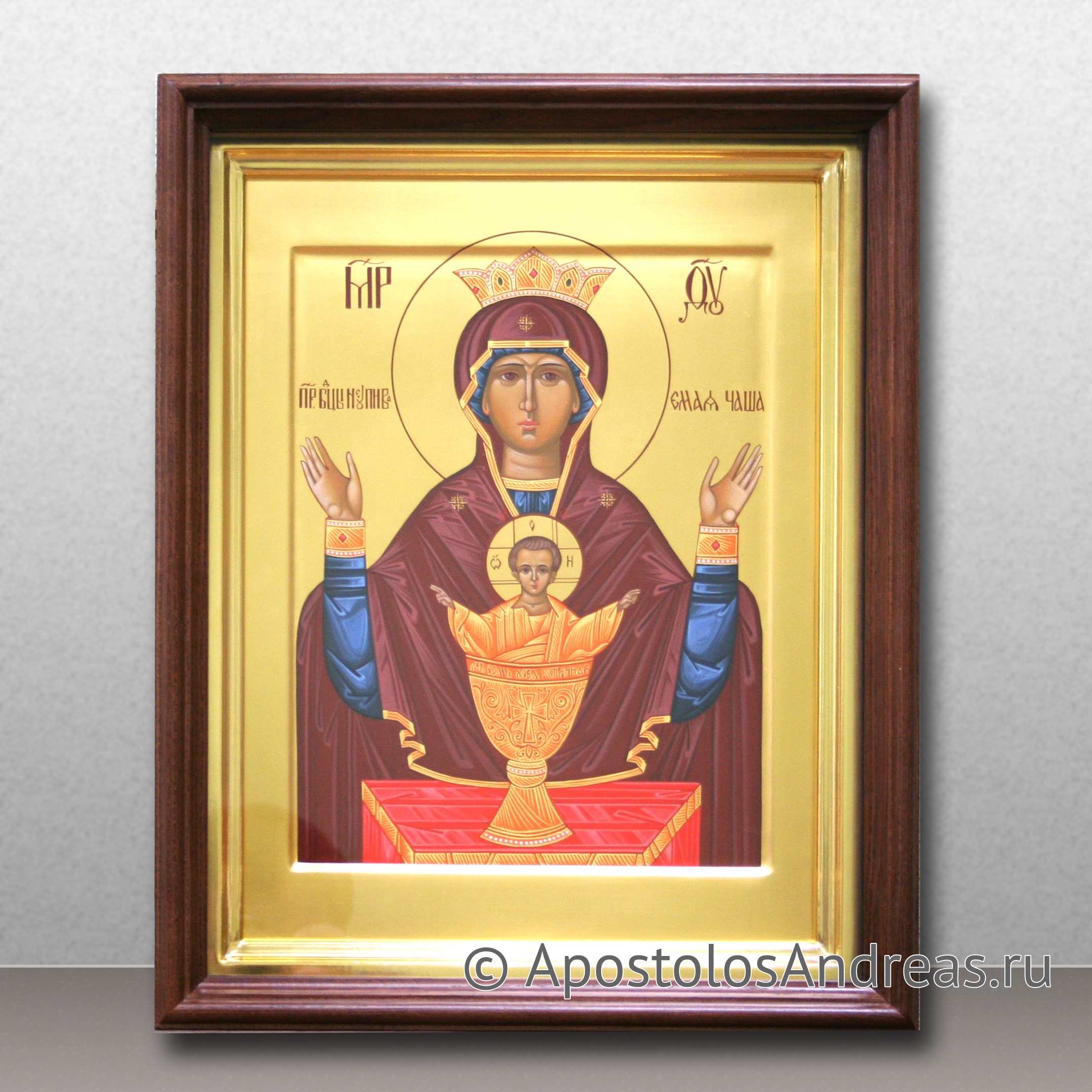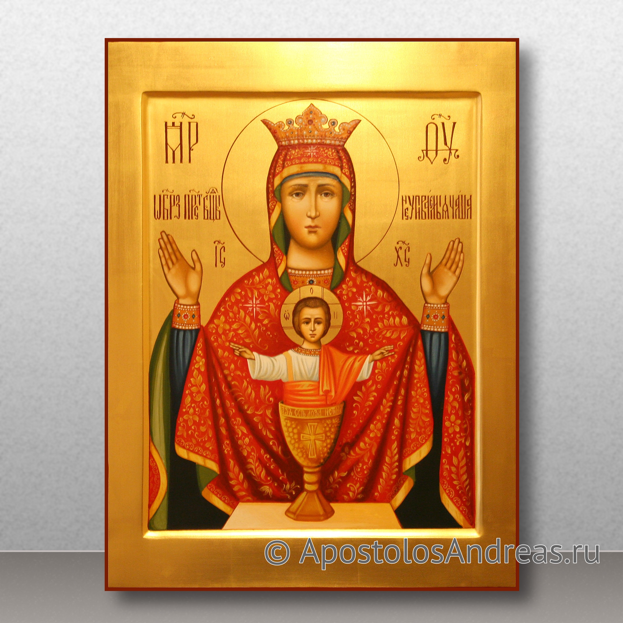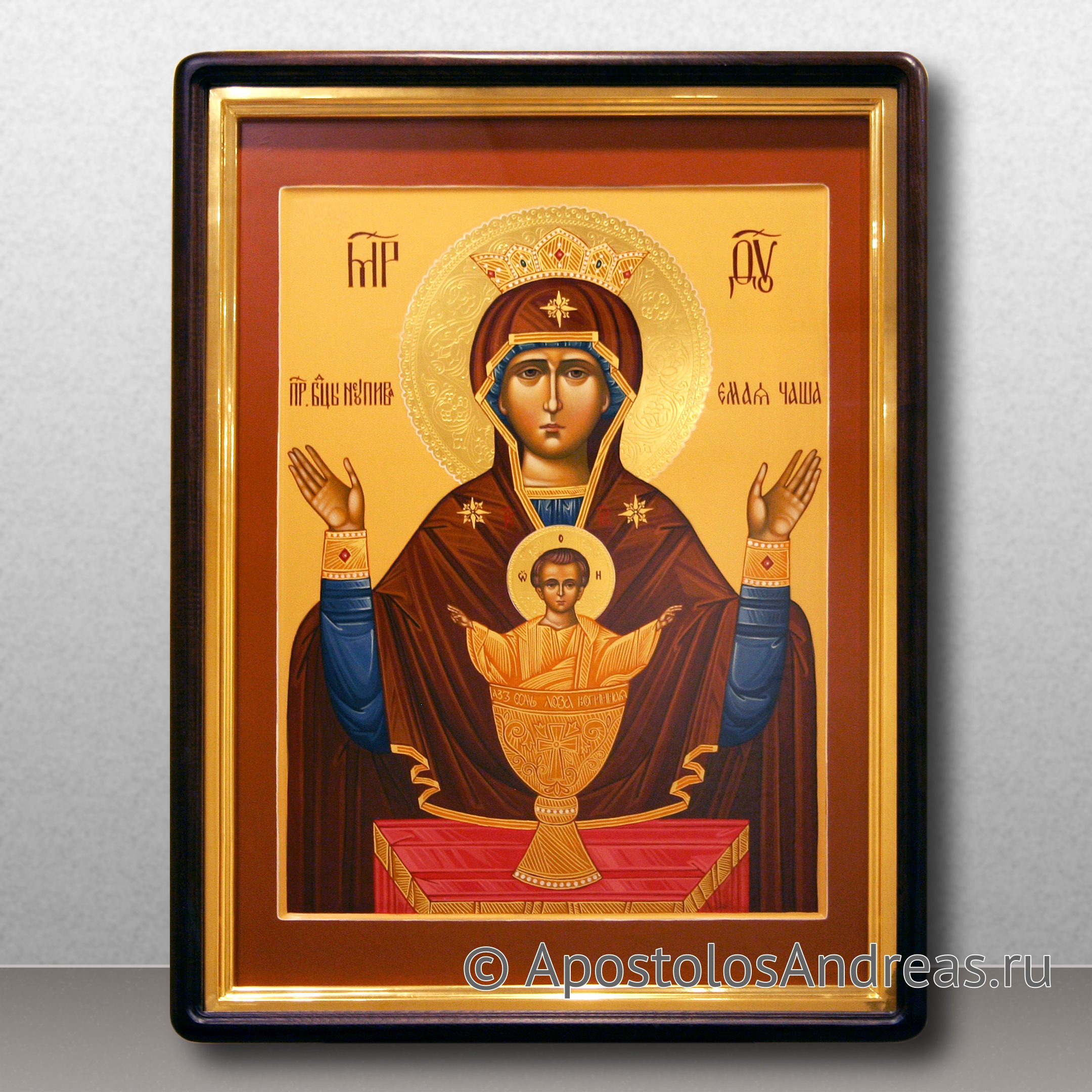 Всего несколько веков назад была обнаружена икона Божией Матери «Неупиваемая чаша». Доподлинно о ее происхождении ничего неизвестно, хотя многие мастера-иконописцы и историки пытаются разгадать тайну появления чудотворного образа. На полотне изображены Богородица и младенец Иисус, стоящий в золотой чаше. Чаша представляет собой символ причащения, отпущения грехов и утешения. Купить рукописную икону Неупиваемая Чаша вы можете в нашей мастерской.