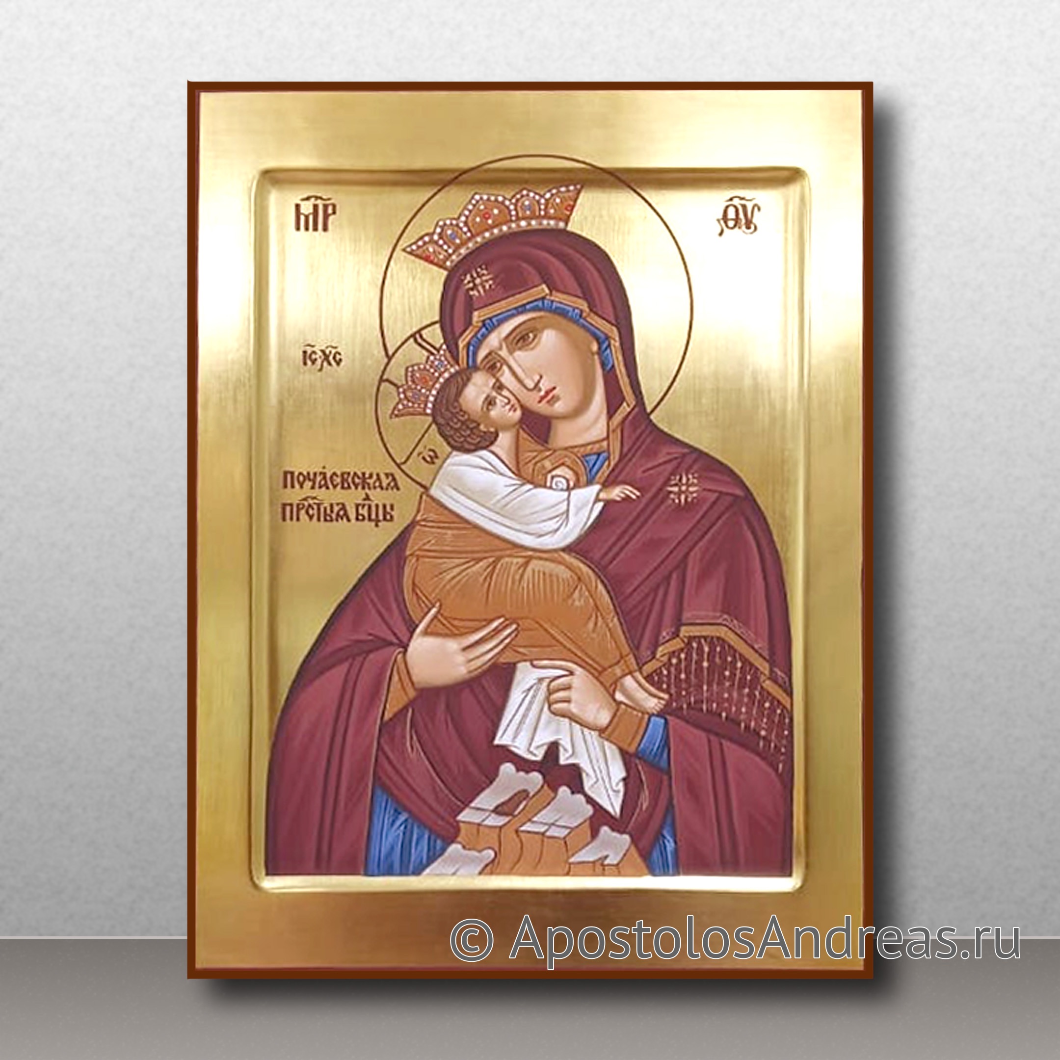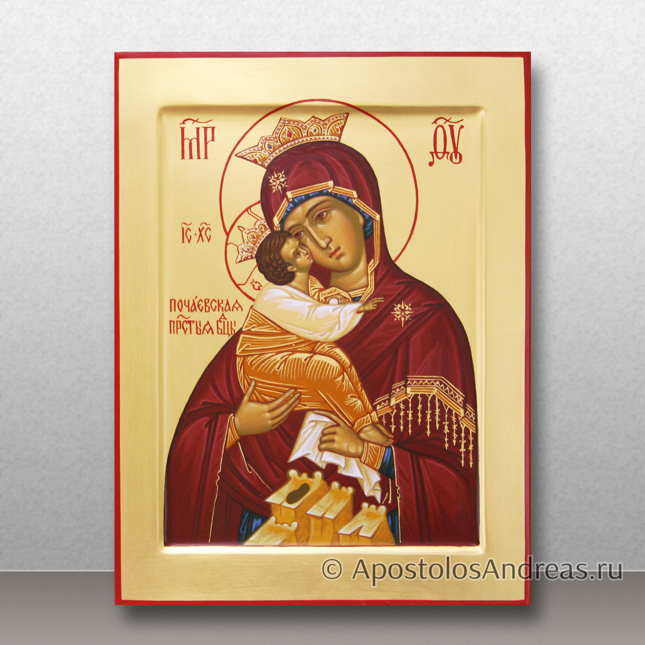 Почаев – значимый религиозный центр, к которому устремляются потоки верующих христиан со всего мира. Именно поэтому икона имеет очень большое значение для всех верующих христиан. В нашей мастерской вы можете купить рукописную икону Божия Матерь Почаевская.