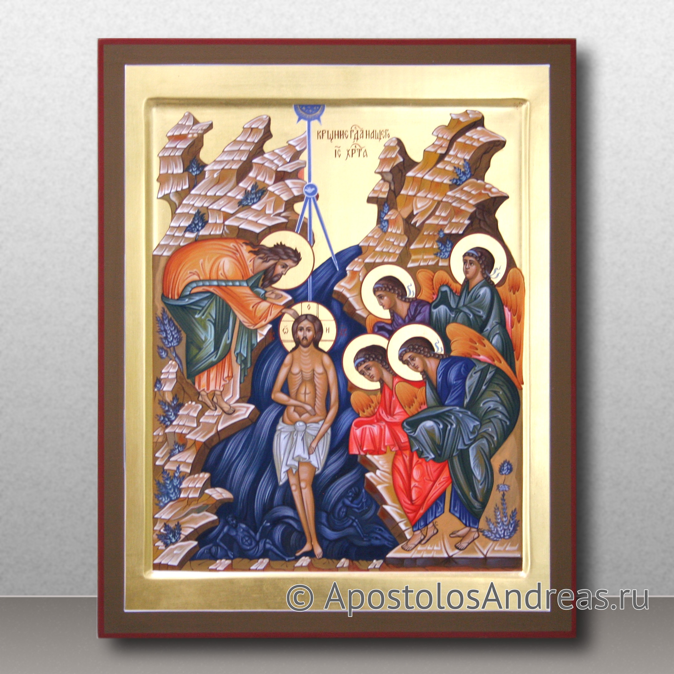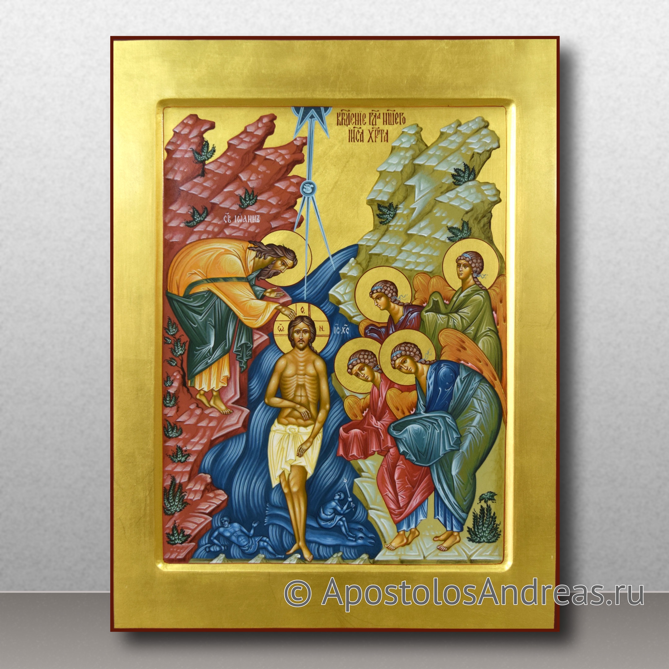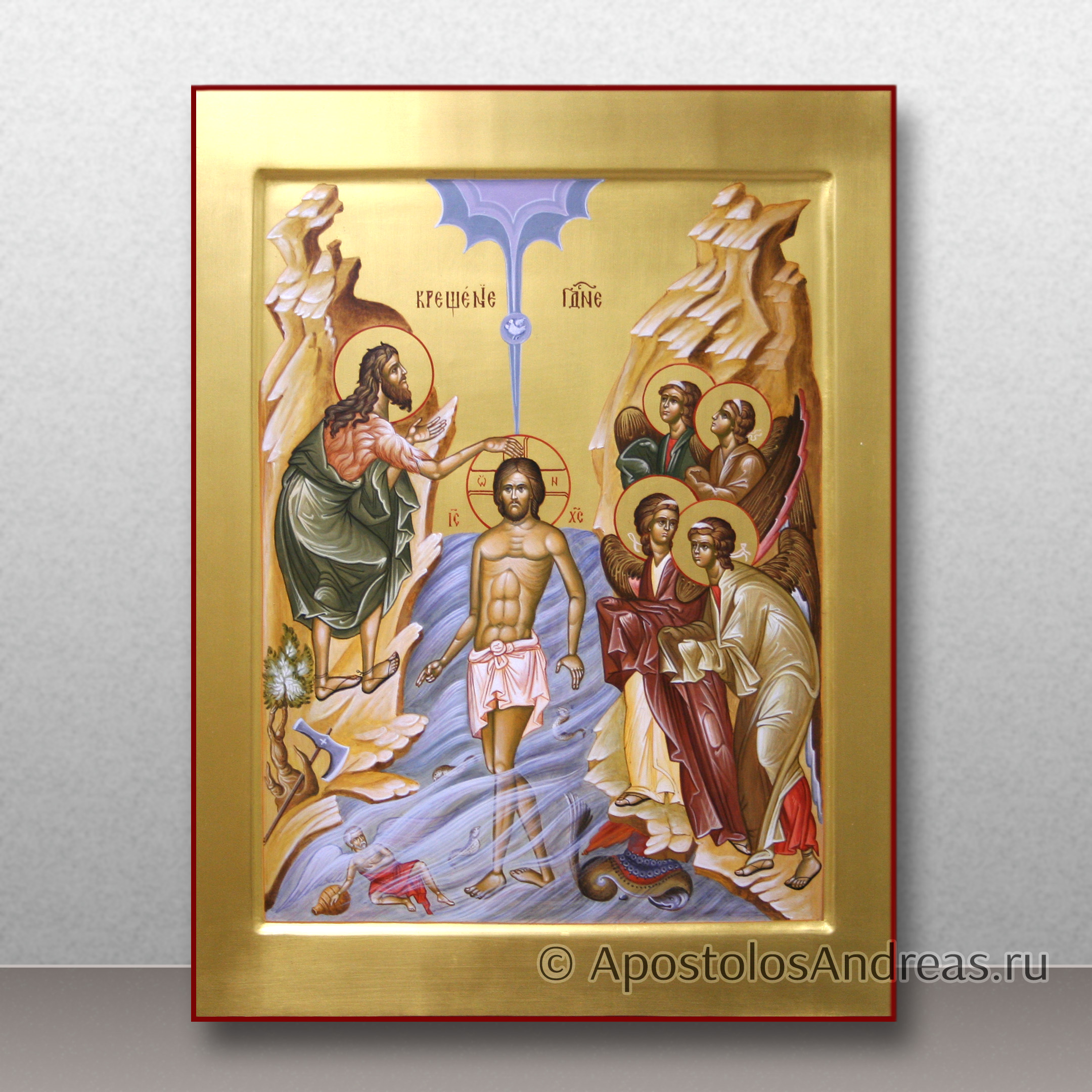 - В центре композиции изображён Христос, стоящий по пояс в водах реки Иордан. Обычно Он изображён почти обнажённым, с набедренной повязкой, что символизирует Его смирение и человеческую природу.