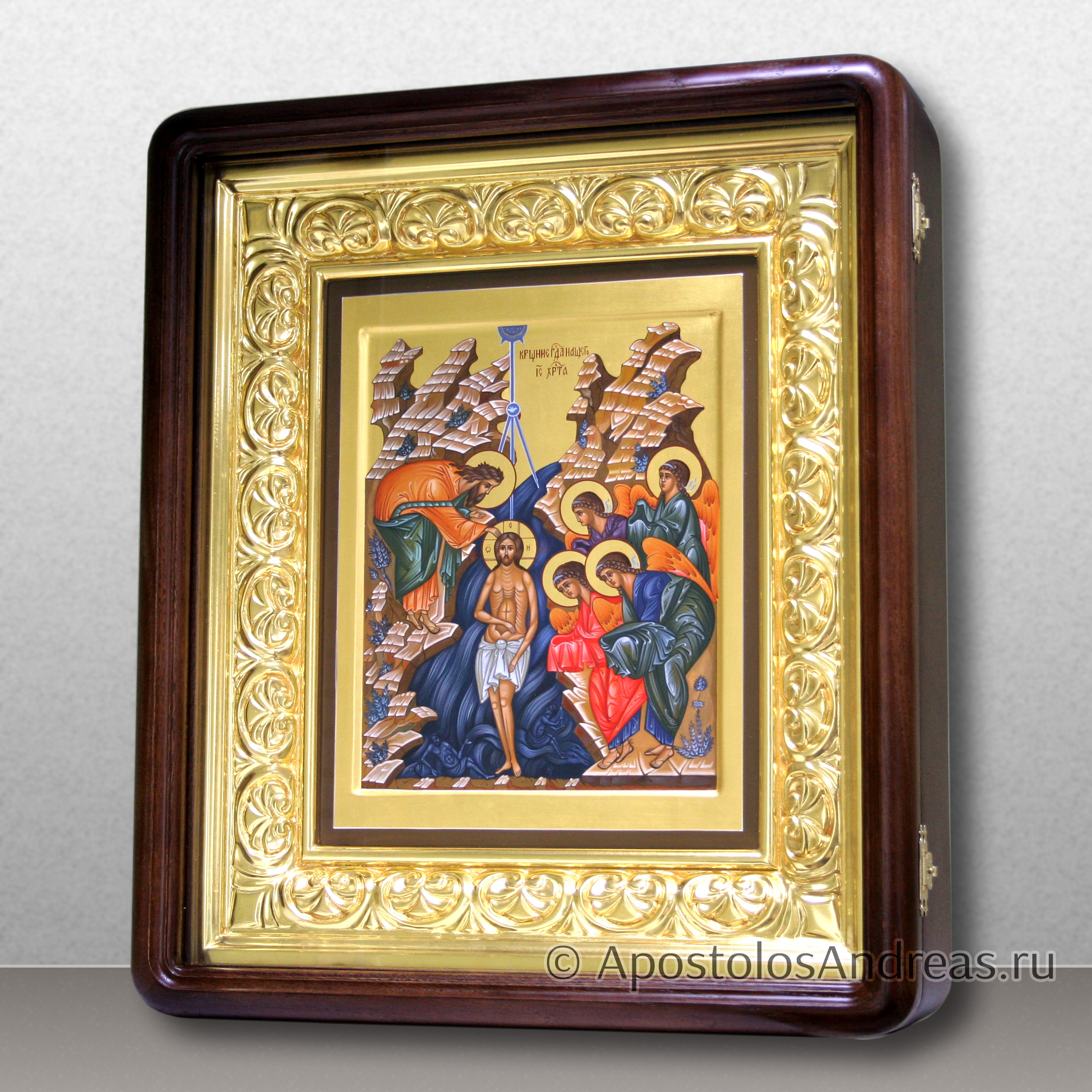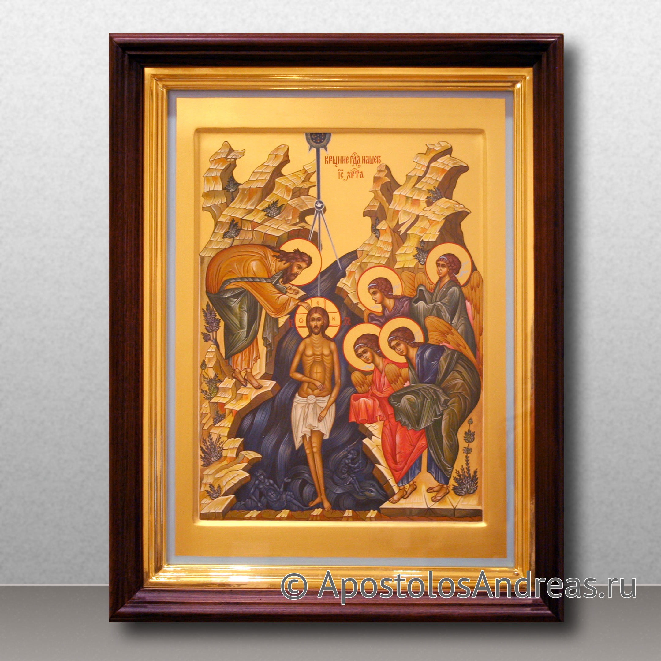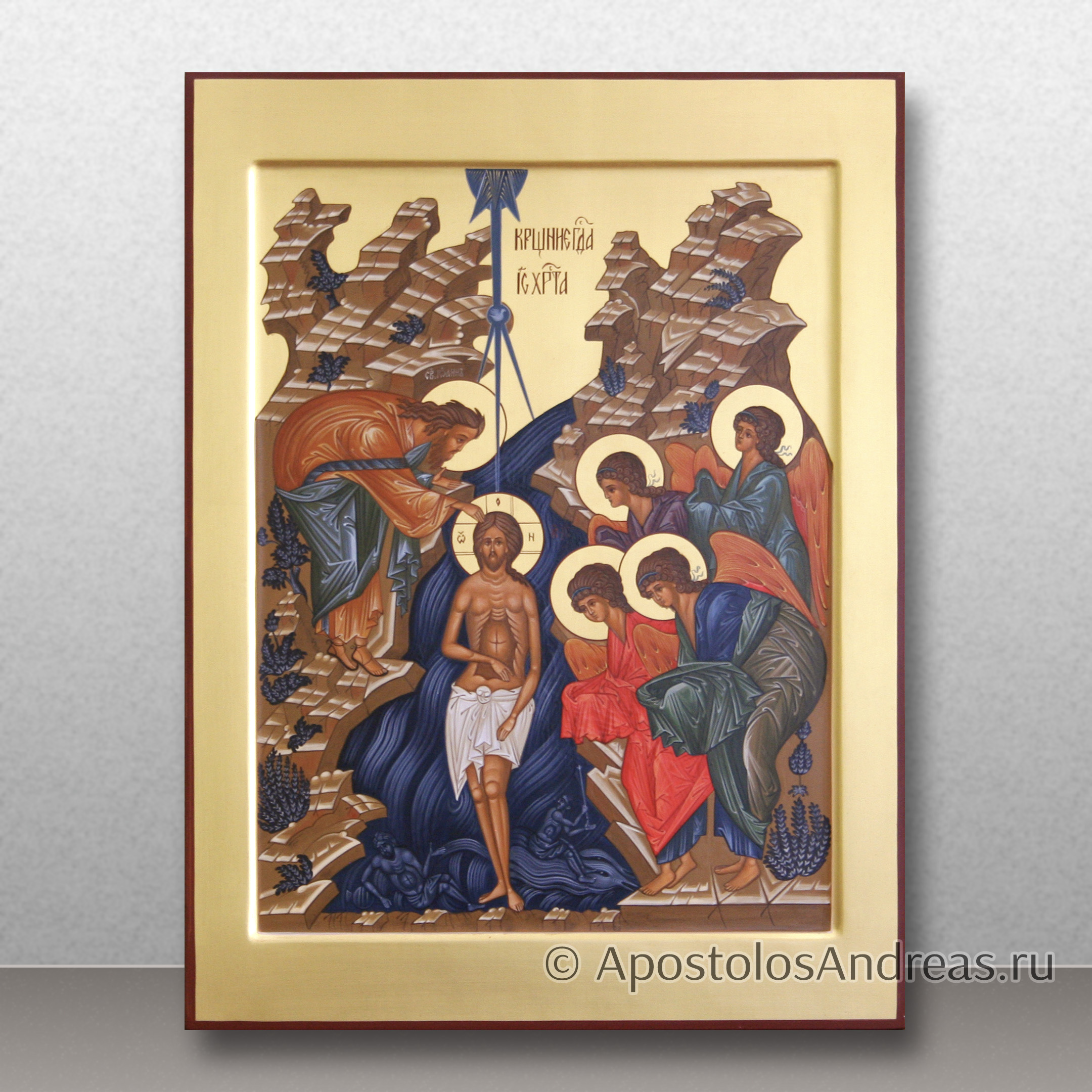 - В центре композиции изображён Христос, стоящий по пояс в водах реки Иордан. Обычно Он изображён почти обнажённым, с набедренной повязкой, что символизирует Его смирение и человеческую природу.