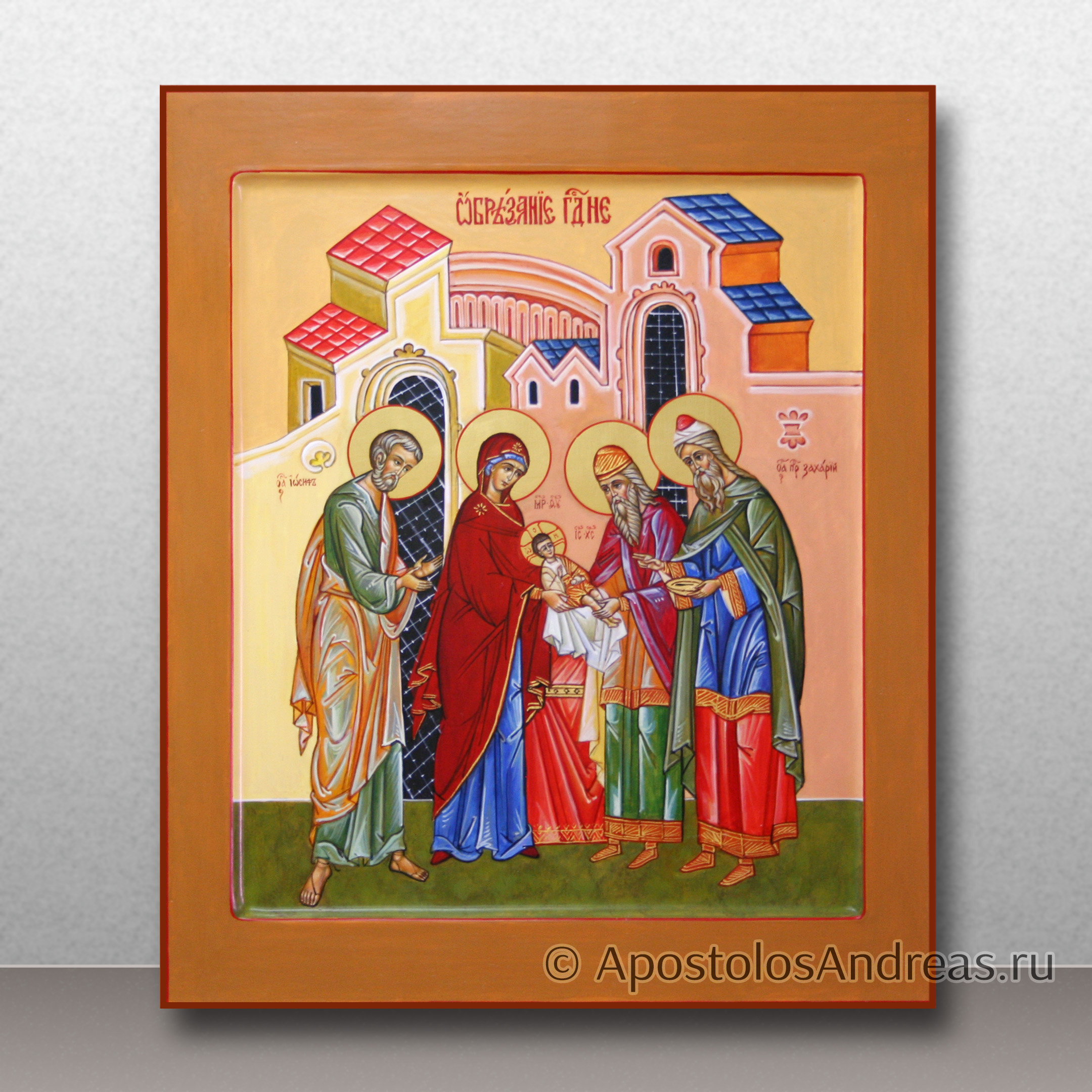 Икона "Обрезание Господне" изображает один из важных евангельских сюжетов, который традиционно представлен в православной иконографии. На этой иконе обычно можно увидеть следующие элементы:
