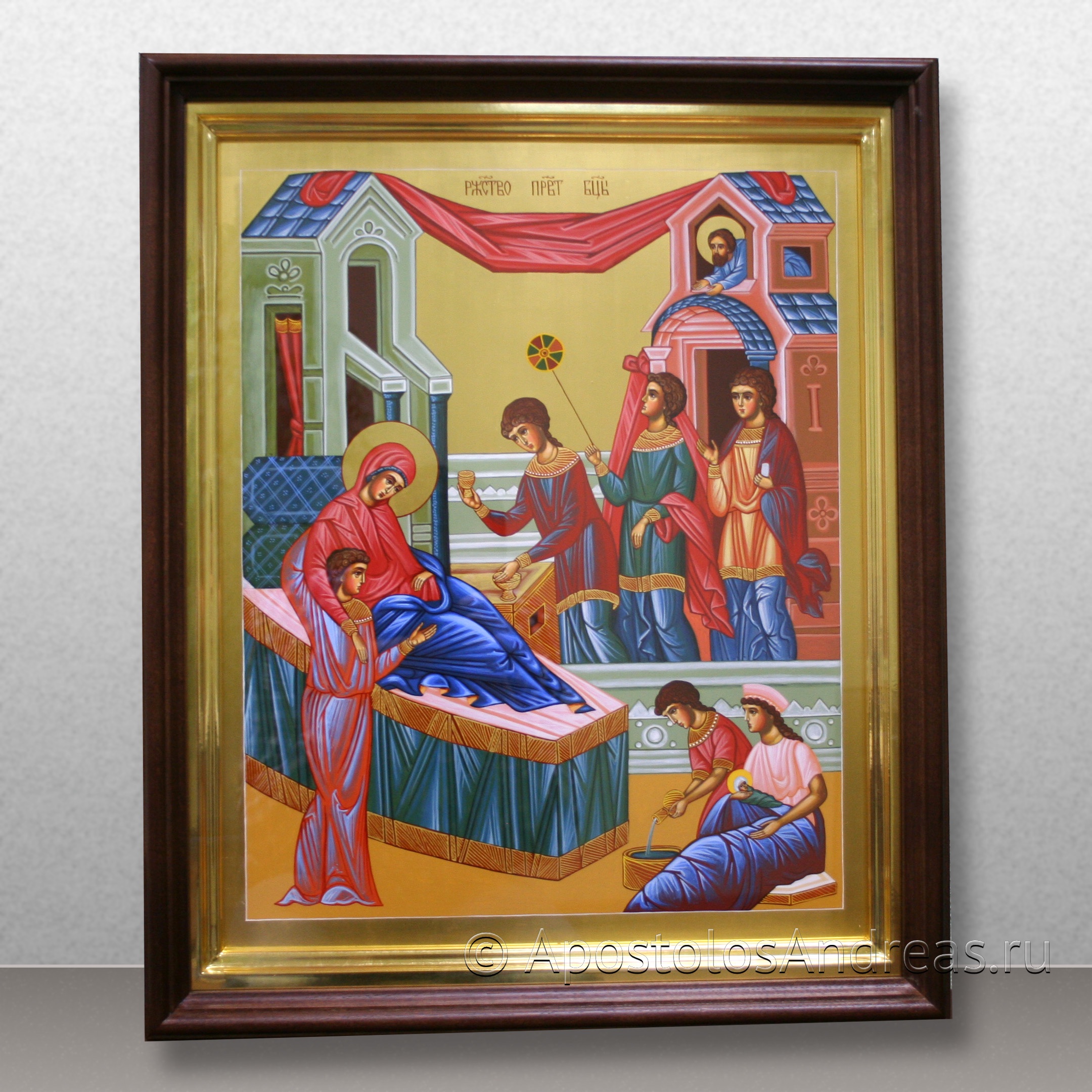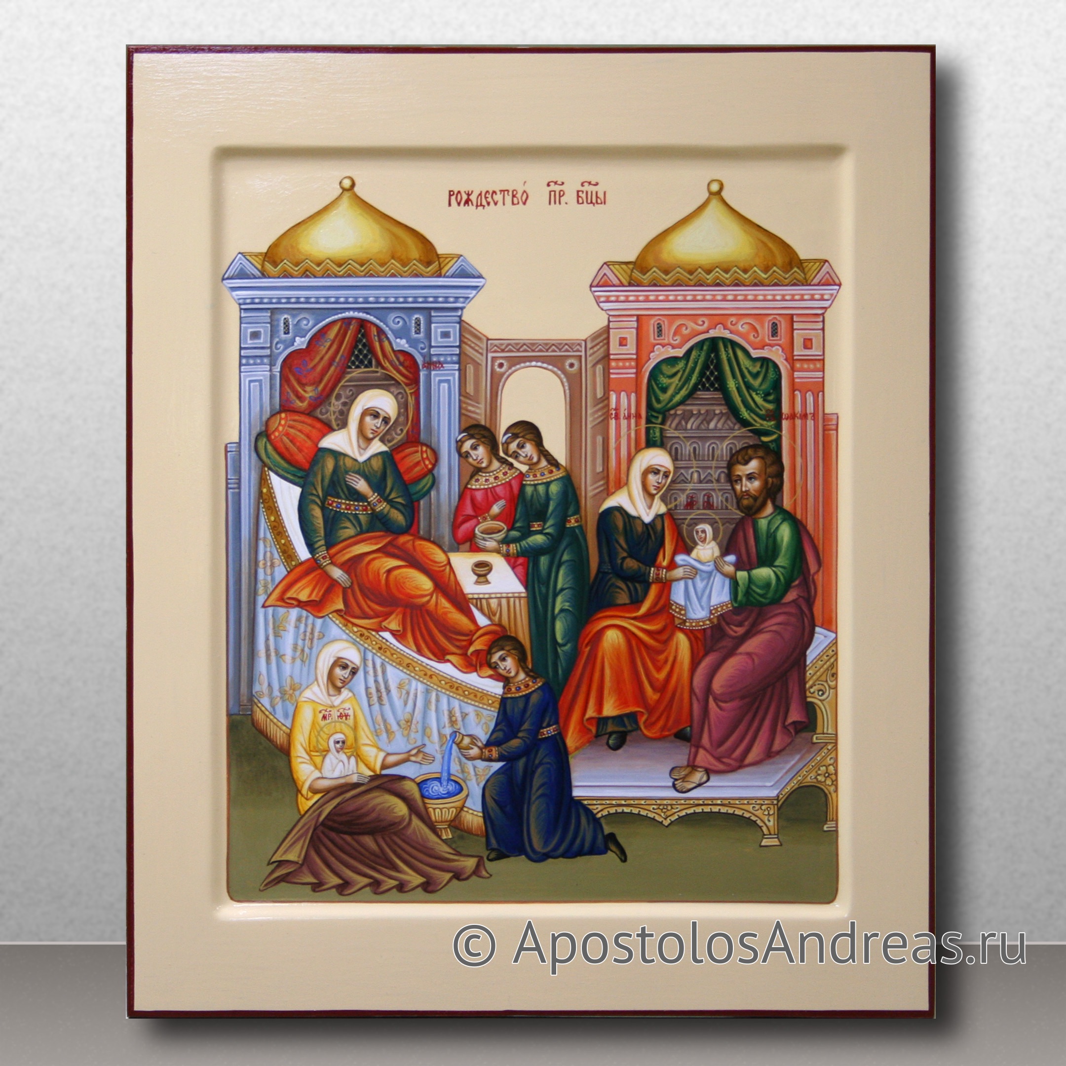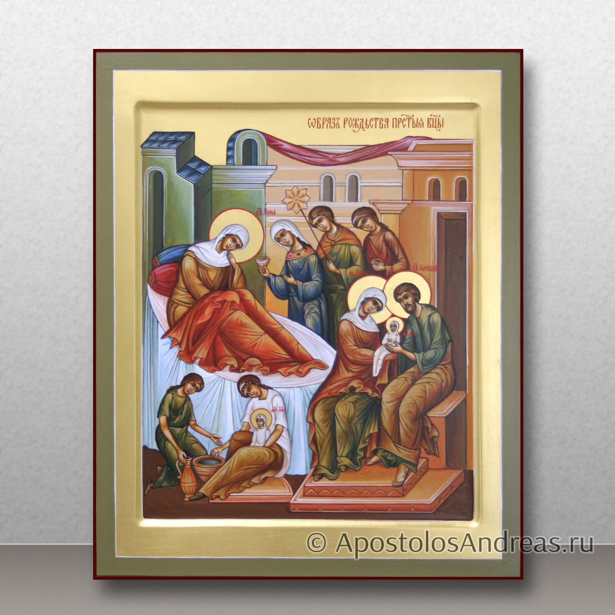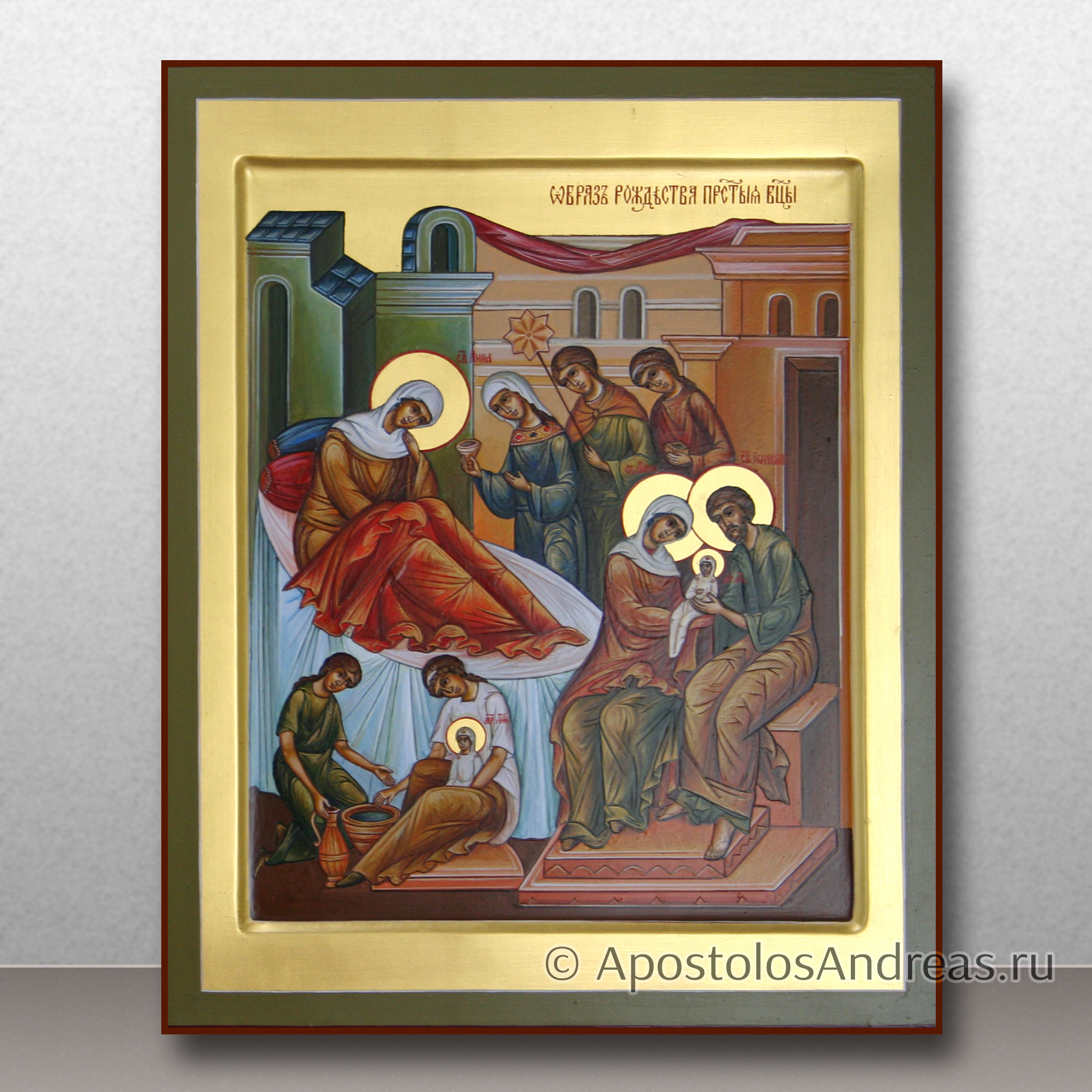 Икона «Рождество Пресвятой Богородицы» изображает момент рождения Девы Марии, одной из важнейших святых в христианской традиции. Композиция иконы обычно насыщена символами и деталями, которые подчеркивают святость и значимость этого события. В центре иконы находится святая Анна, мать Пресвятой Богородицы, лежащая на ложа после родов. Её поза и выражение лица часто передают чувство умиротворения и радости.