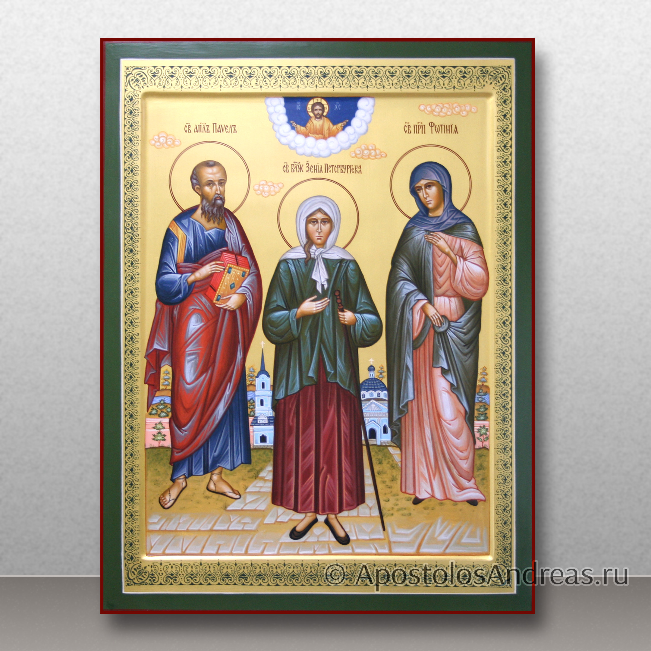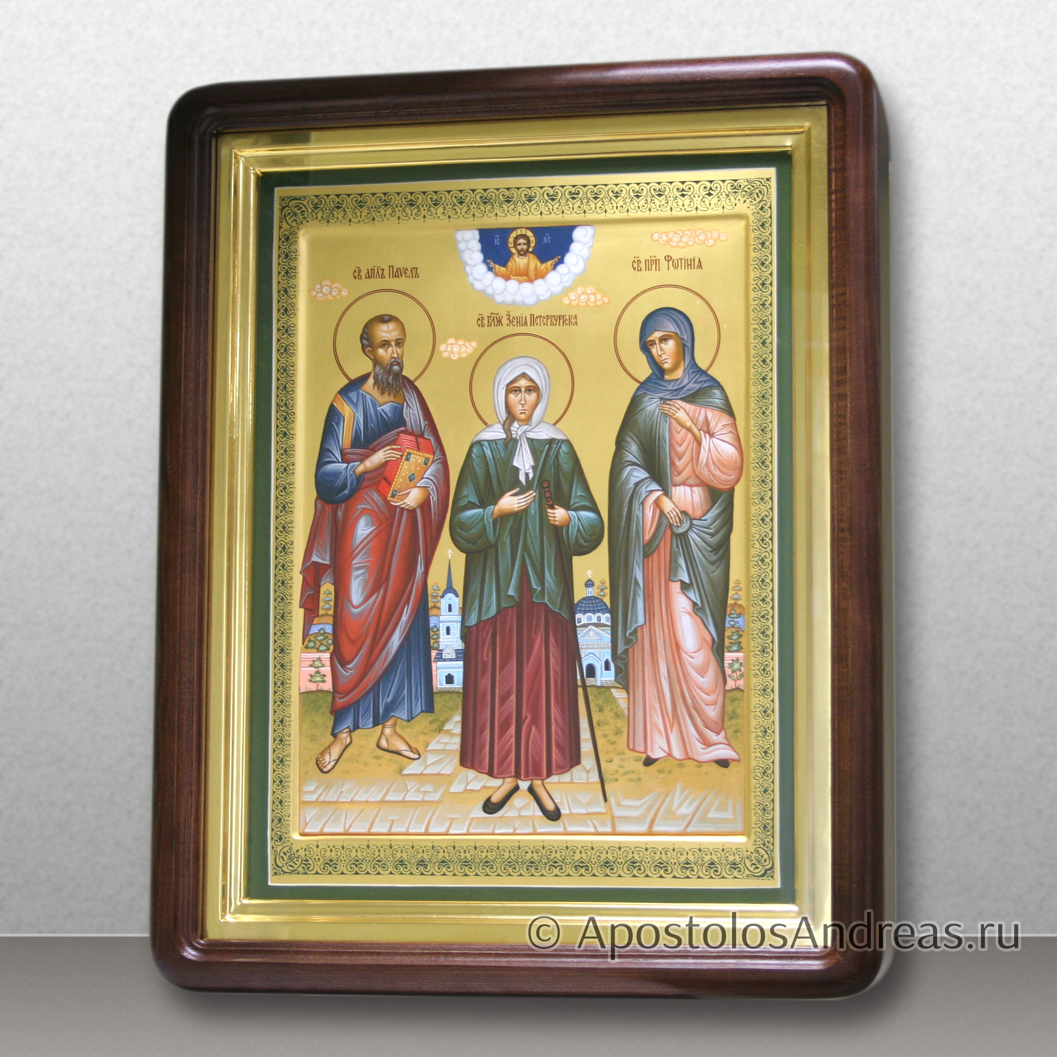 Рукописная семейная икона с тремя святыми и предстоящими на заказ.