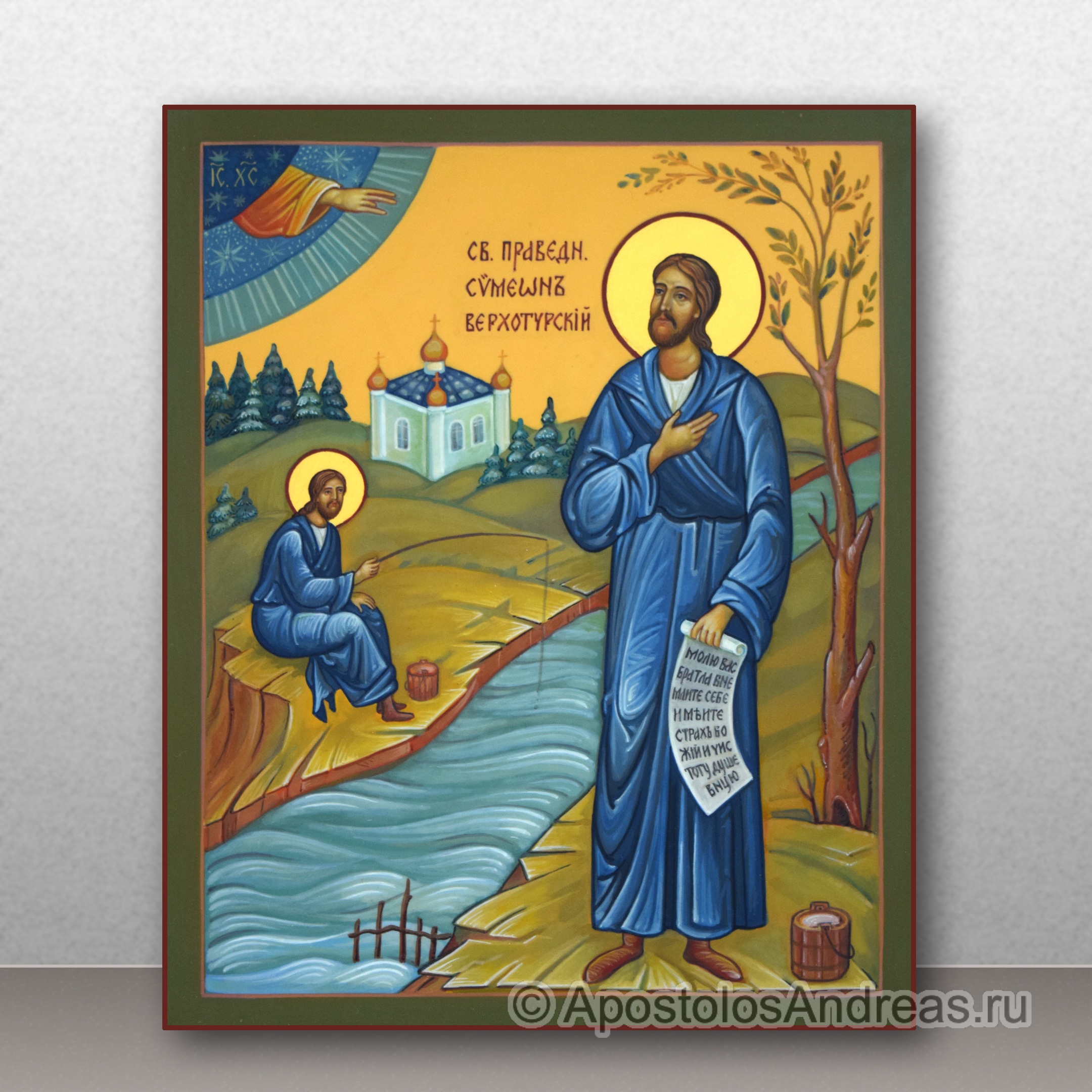 В рукописных святцах читаем: «св. праведный Симеон Меркушинский, новый чудотворец, преставися в лето 7150 (1642)». Праведный Симеон был родом из дворян, но, скрыв знатность свою в смирении христианском, вел жизнь бедняка. Переходя из деревни в деревню, шил он платье, преимущественно для бедных; кончив работу, уходил из дома рано по утру, когда все спали, чтобы избежать не только денежной платы, но в слова благодарного за работу. Он доволен был и тем, что давали пищу и кров. Чаще всего проживал он в погосте Меркушах, в 50 верстах от Верхотурья, где была пристань судов, плававших по реке Туре. Он любил в тиши уединения наслаждаться природою и хвалить Творца ее. Когда не было работы, брал он уду, садился на берегу реки и доставал оттуда лишь нужное для дня. Еще поныне цела ель, на утесистом берегу реки Туры, где любил сидеть блаженный, занимаясь ловлею рыбы. Вогуличи и другие инородцы края тогда были новыми христианами.
