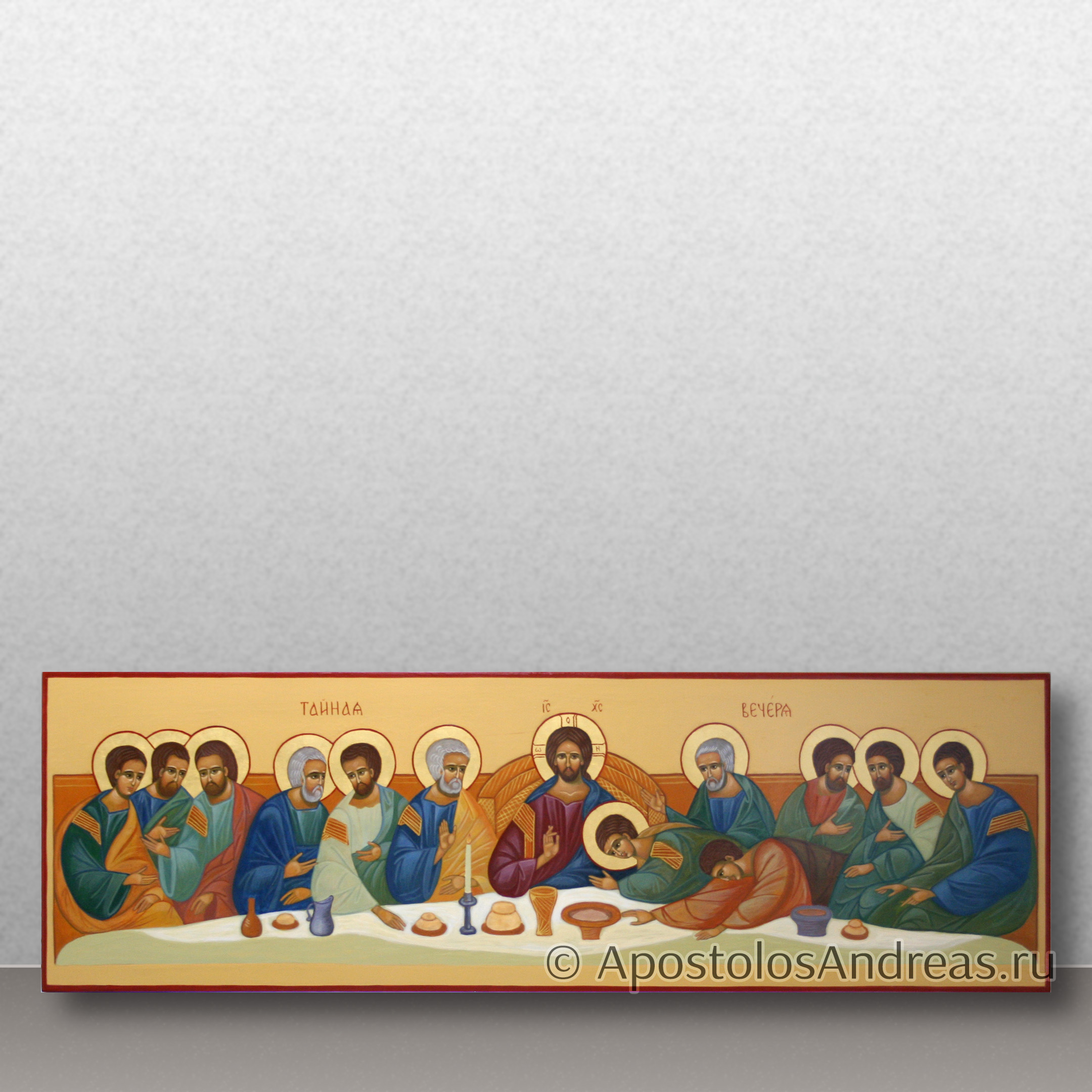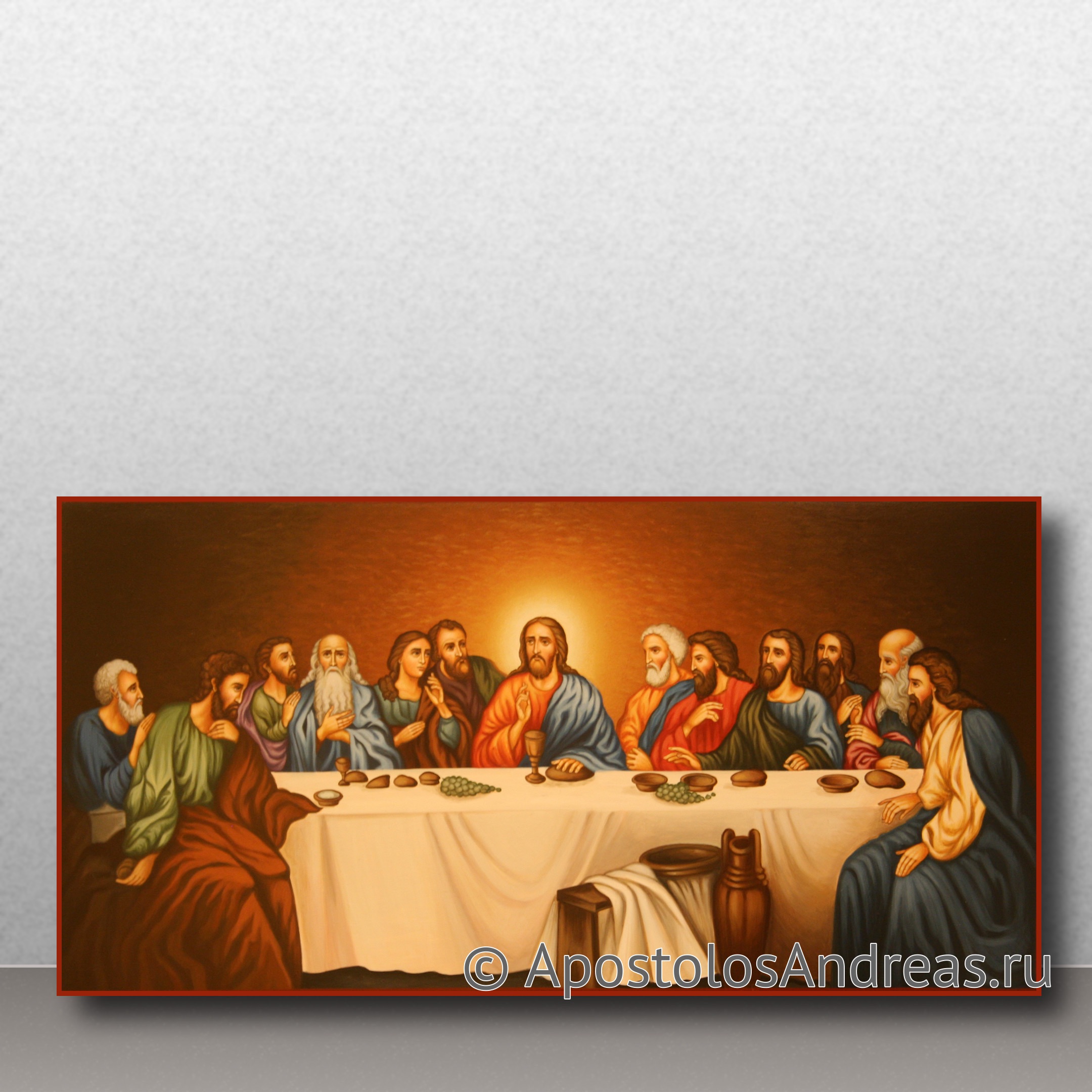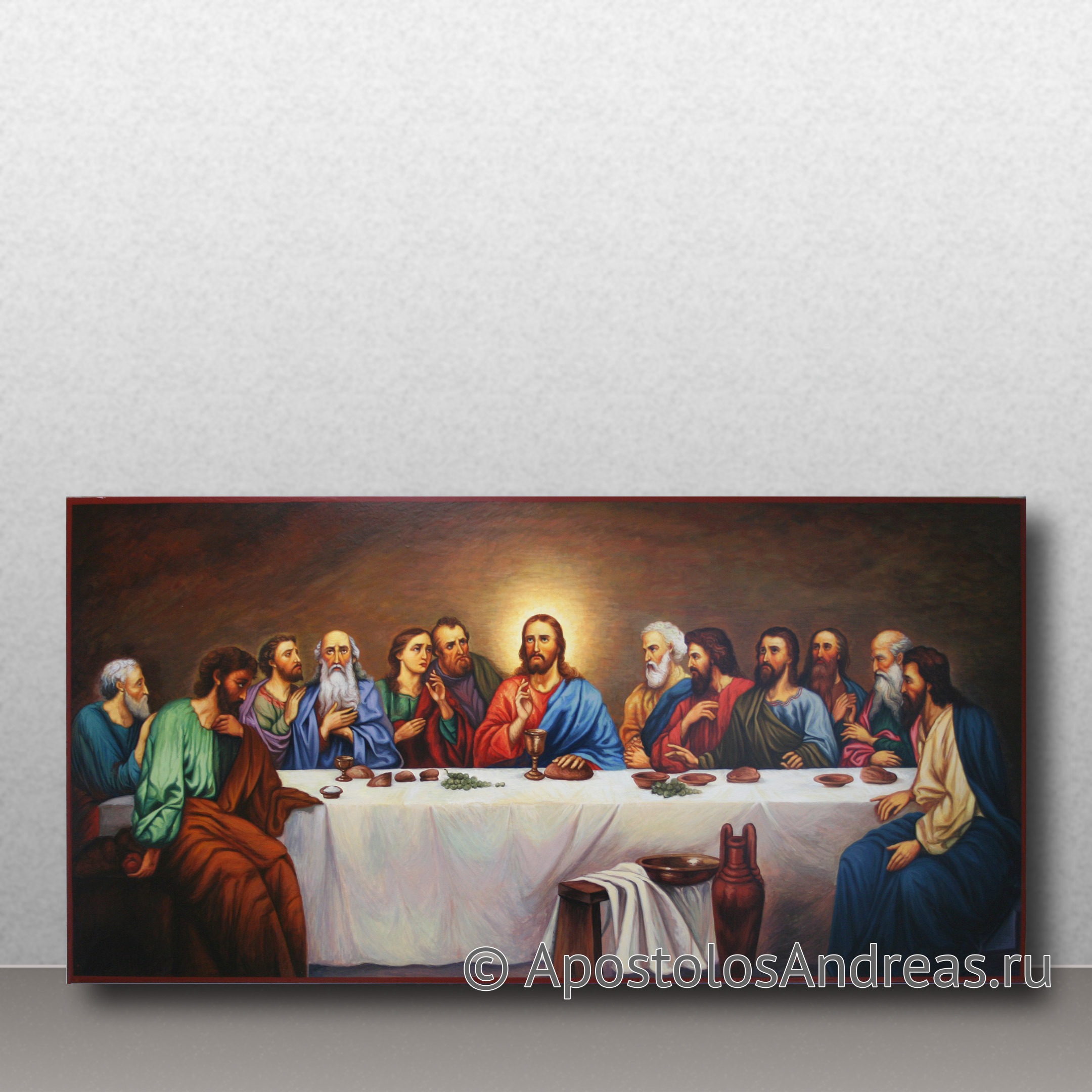 - Стол: Стол, за которым сидят Иисус и апостолы, является важным элементом композиции. На столе могут быть изображены хлеб и вино, символы Евхаристии, а также другие традиционные блюда пасхальной трапезы.