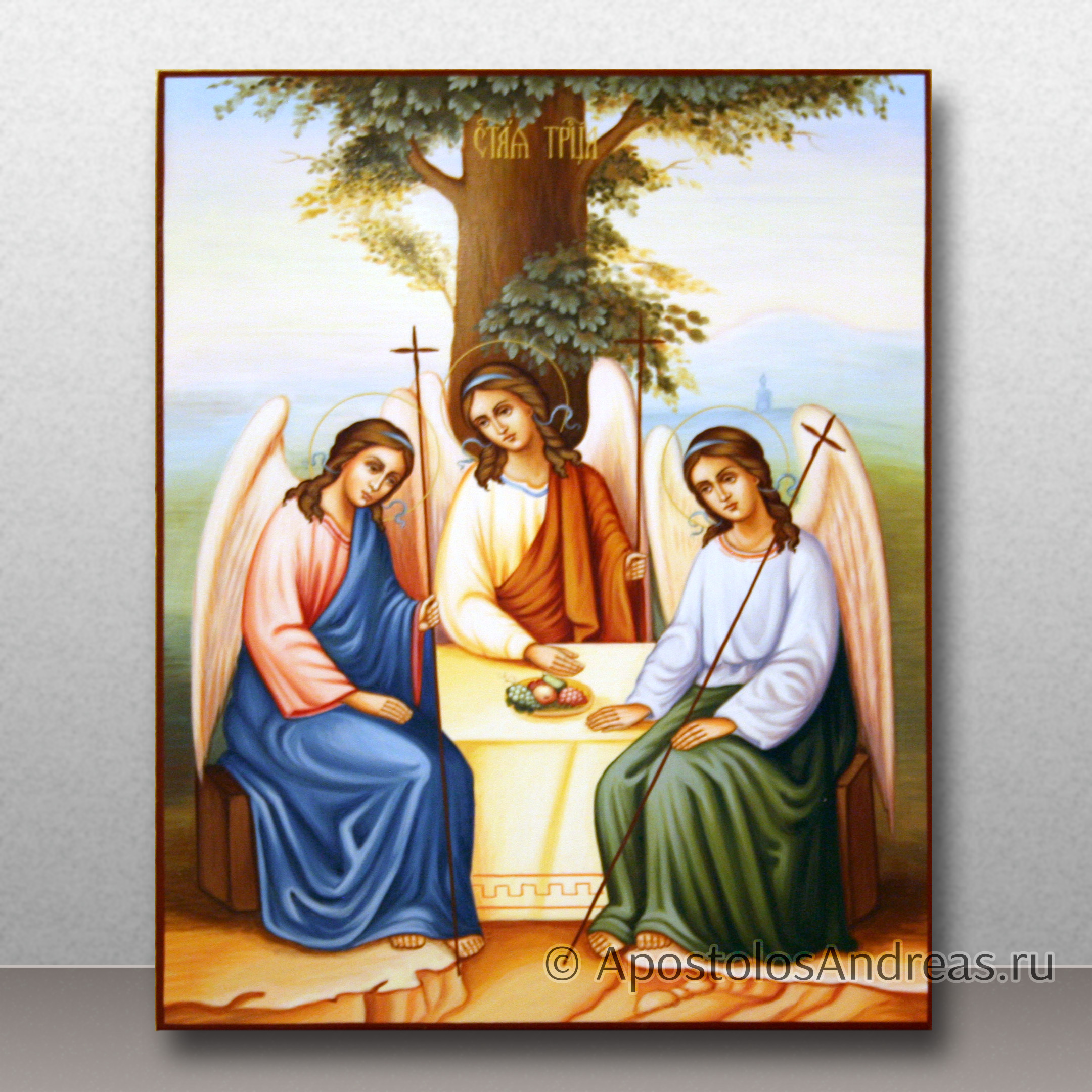 Икона "Святая Троица", выполненная в академическом стиле, обычно изображает Бога Отца, Сына и Святого Духа с особым вниманием к реалистическим деталям. Каждое лицо и фигура прорисованы с высокой степенью точности, передавая не только духовную сущность, но и человеческие черты. Ангелы сидят вокруг стола, символизирующего жертвенную трапезу, а их позы и выражения лиц выражают глубокое смирение и благоговение.