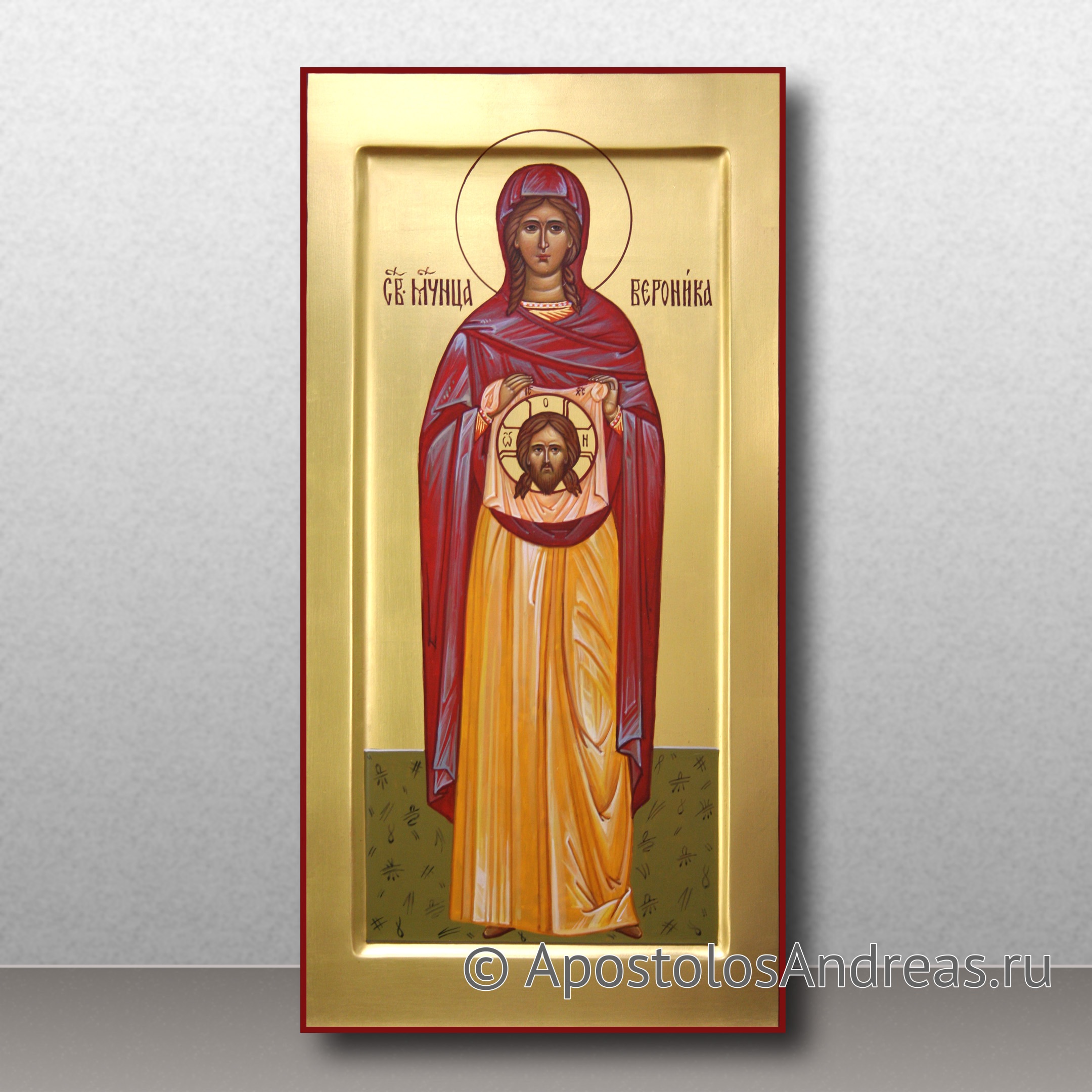 Праведная Вероника, по преданию, была женщиной, исцеленной от кровотечения прикосновением к краю ризы Христа (Мф. 9, 20-22). Она присутствовала в Иерусалиме во время осуждения Иисуса Христа на крестные страдания. Когда Спаситель нес крест на Голгофу, Вероника, следуя за толпой иудеев, увидела Его, упавшего под тяжестью креста. Сжалившись над Ним, она подбежала, напоила Его водой и вытерла полотенцем окровавленное лицо Христа. Вернувшись домой, Вероника обнаружила, что на полотенце запечатлелся лик Спасителя. Это полотенце, известное как Нерукотворный образ, со временем попало в Рим. В отличие от Нерукотворного образа Восточной Церкви, на римском образе на челе Спасителя изображен терновый венец.